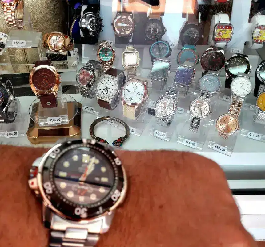Mención especial para el que queda justo por encima de mi Orient, sobre un expositor rotatorio, una caja imitación/copia cojín de Panerai que daba risa verla, de plástico con unas irregularidades tremendas en el acabado.