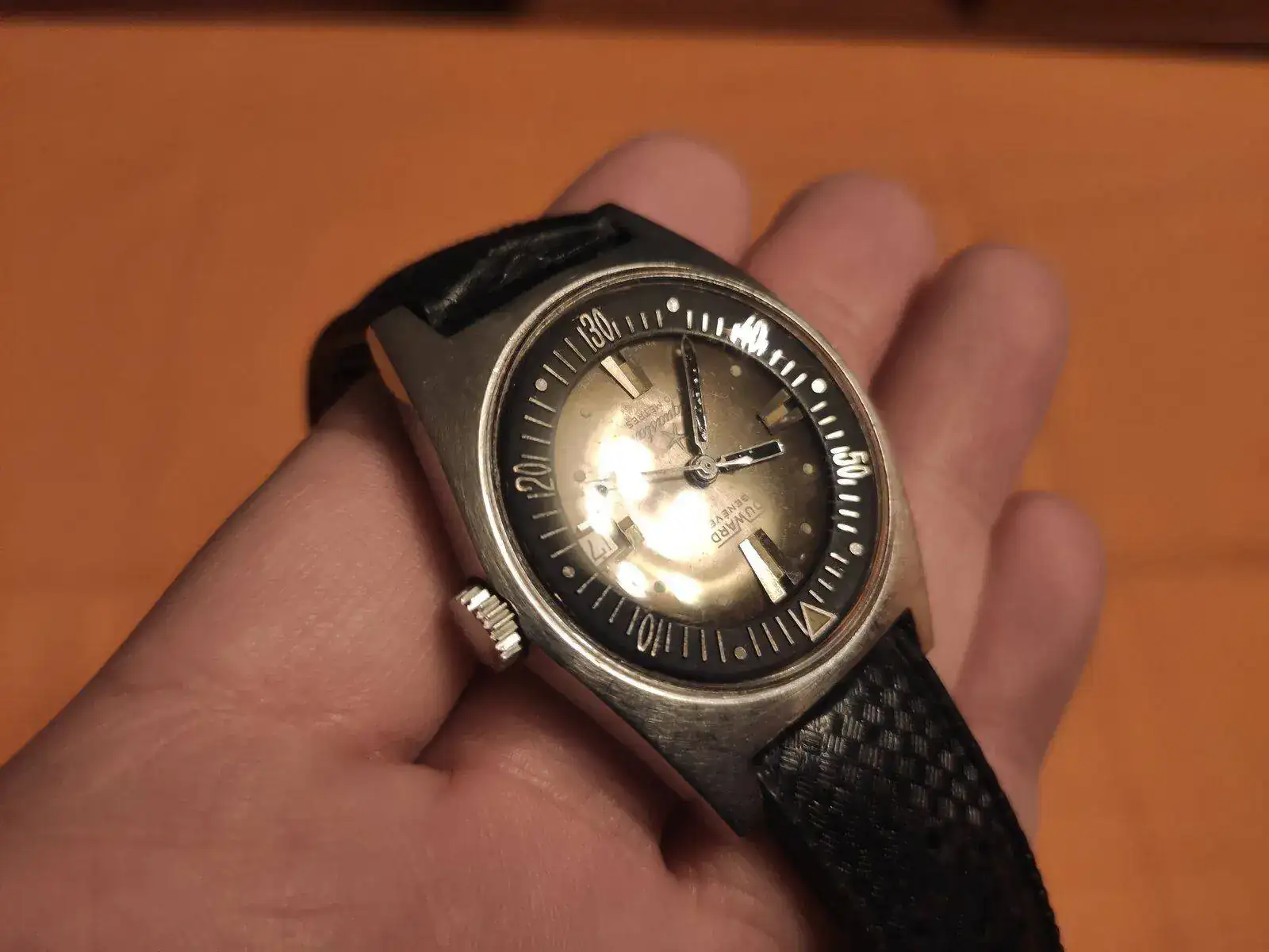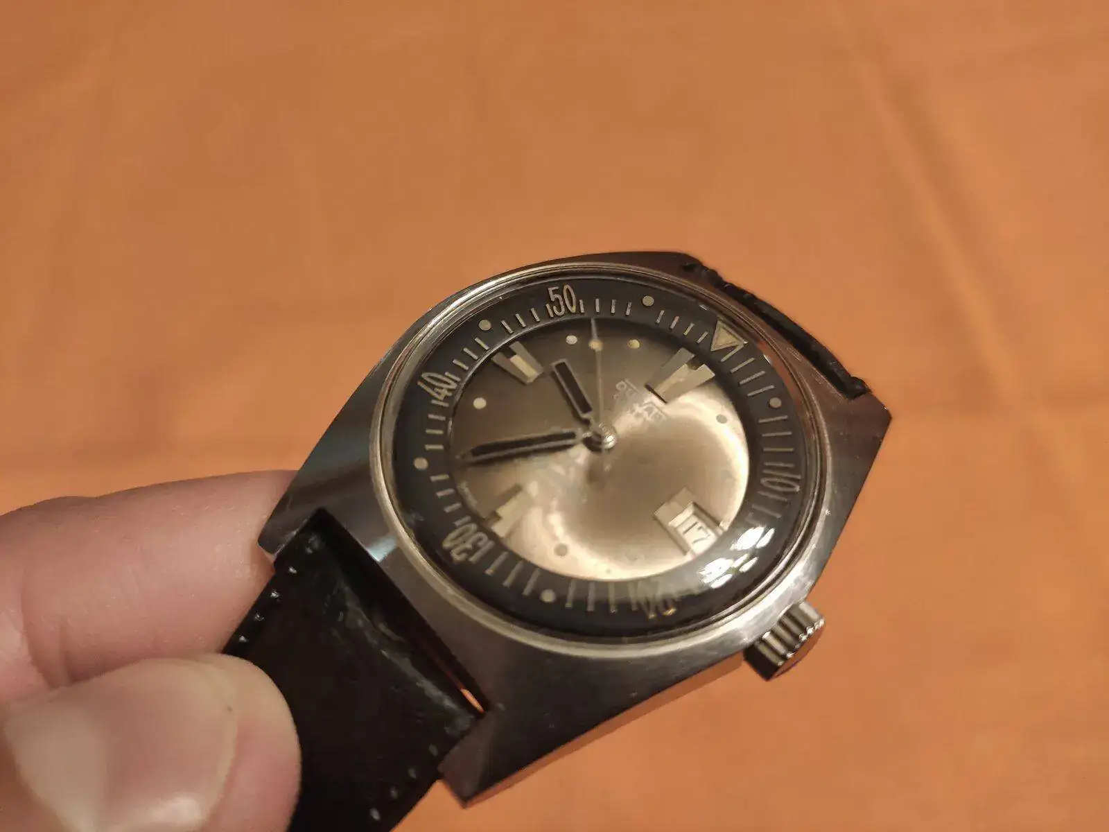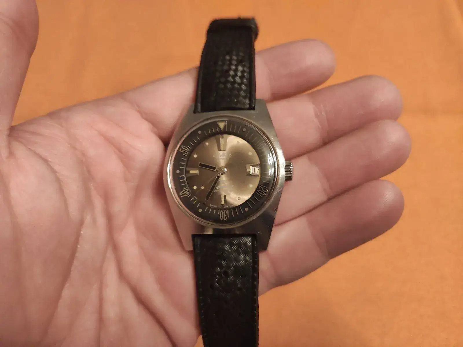 Tras un par de semanas (tuvieron que buscar el repuesto de una rueda rota) me llaman que lo vaya a recoger. Esta tarde me pasé por allí, la dependienta me dice que quedó perfecto que está funcionando muy bien. Y que por cortesía me han arreglado las aguas que estaban muy deterioradas. Aquí me extraño y al ver el reloj me quedé de piedra. Pintaron las agujas de negro con algún tipo de esmalte brillante, que así queda más bonito y hace juego con el bisel interno.