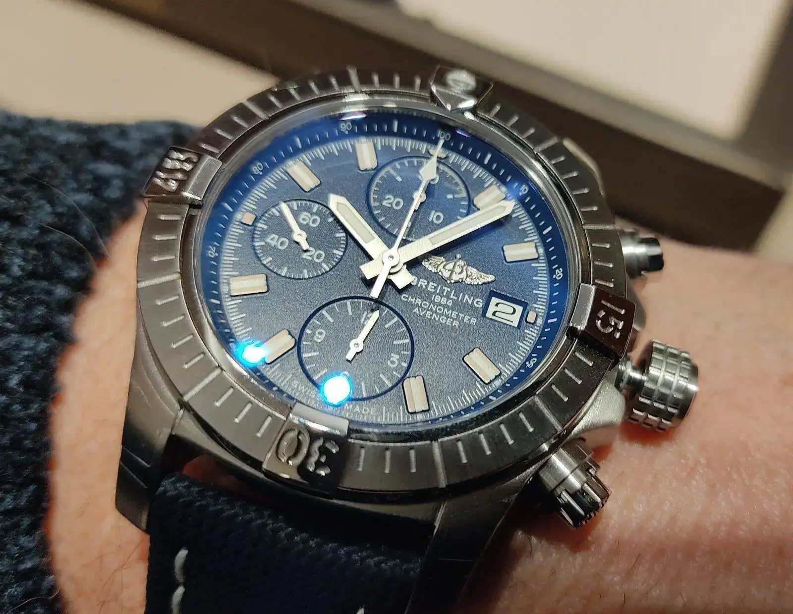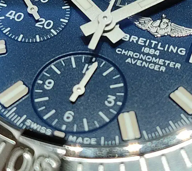 El otro día estuve en relojería CO Breiltling mirando unos relojes de corte deportivo o Diver. Me enseñaron más o menos lo que quería ver de las marcas que solicité. Me llamó la atención un detalle en un Avenger Crono, 5700 €. La aguja de la subesfera a las seis no está centrada.