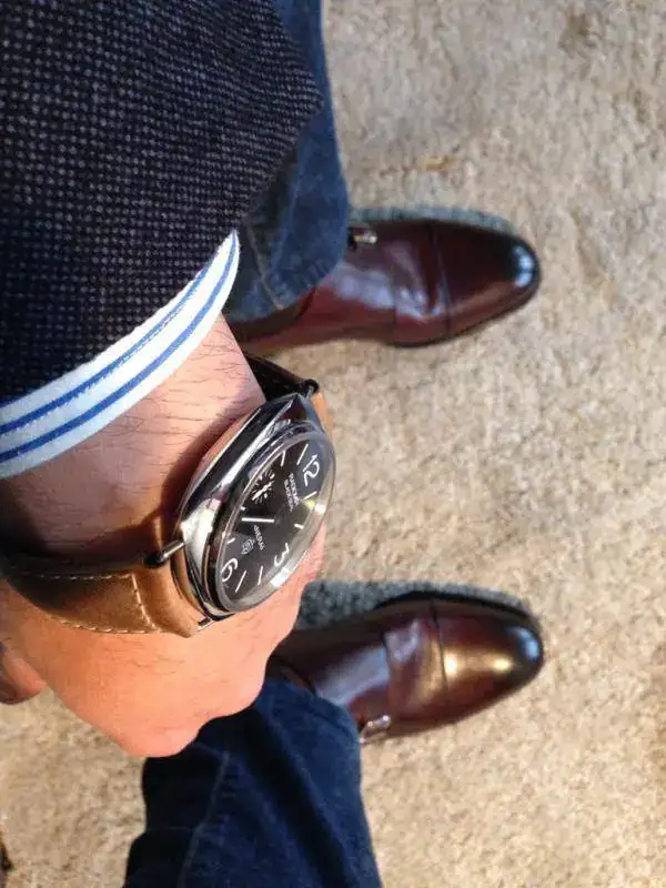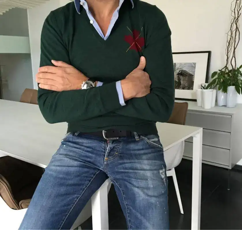 Traje de lana de Corneliani, a medida, azul con raya diplomática, camisa balnca a medida de Xacus, corbata a topos, zapatos bitonos (azul/negro) de Alberto Guardiani y Vacheron Constantin Overseas Chrono.