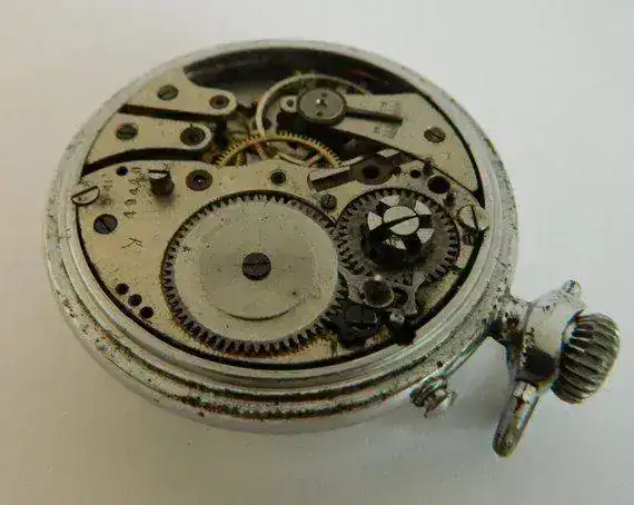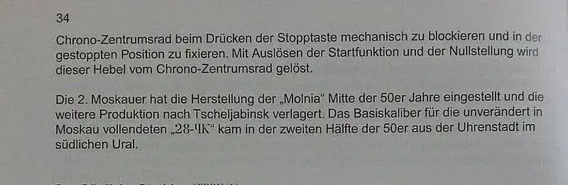 Donde cita la corta tirada del reloj (60000 unidades) su carácter militar y su origen de base en el calibre Molnia 3062. Y aquí me voy a atrever si me dejáis a discrepar con el autor. Se "equivoca" al citar el calibre 3062 como base de este crono, ya que como tal no se fabricó en la 2WF, si que encontramos, ejemplos primerizos de Molnia e Iskra, pero estos calibres estaban mejor construidos, eran más finos y tenían el puente del volante más fino. La base del calibre en definitiva correspondía al Iskra 6 (Chk-6) acrónimo de "reloj de bolsillo con segundero a las 6h" Y era por así decirlo el calibre top, decorado, con volante diferente y que más adelante se transformo en el más basto y con sutiles diferencias constructivas Molnia 3062
