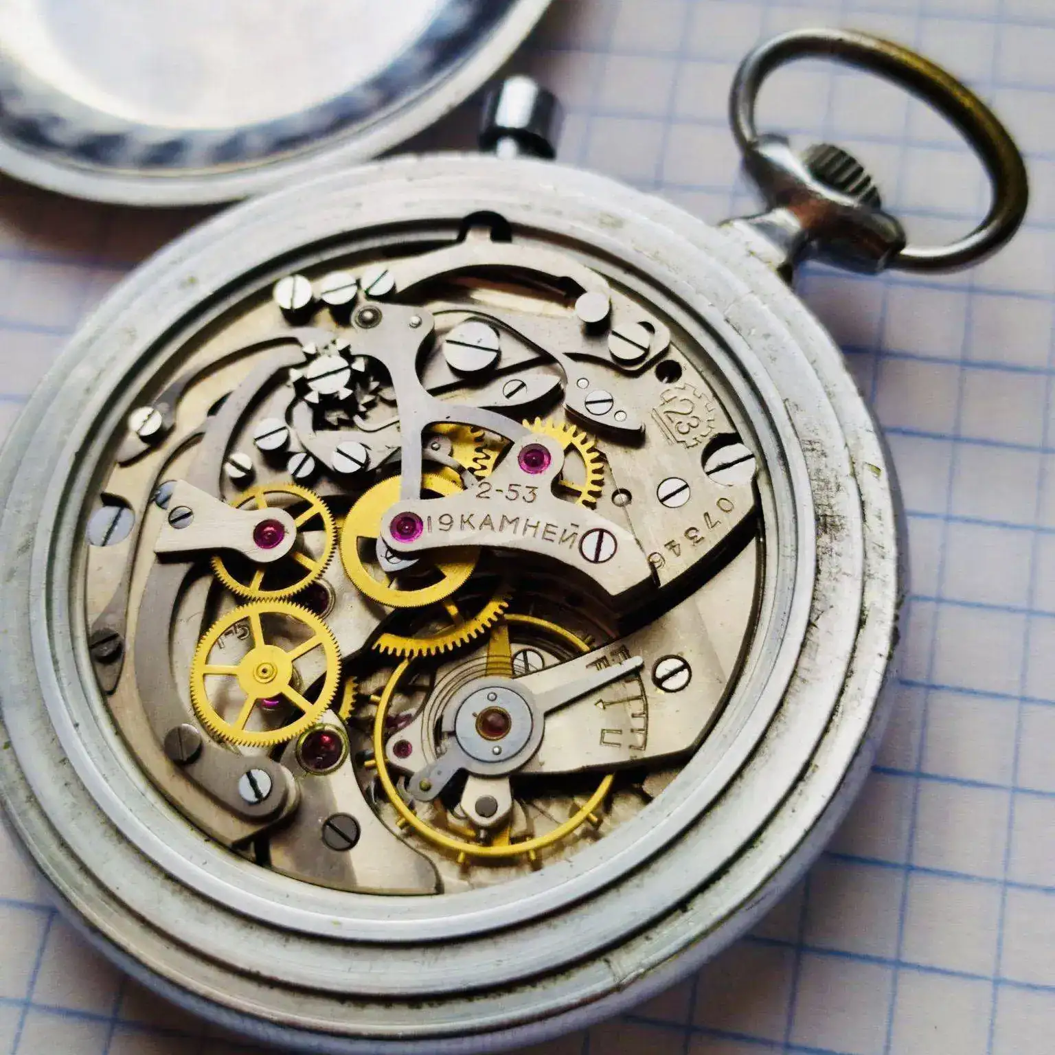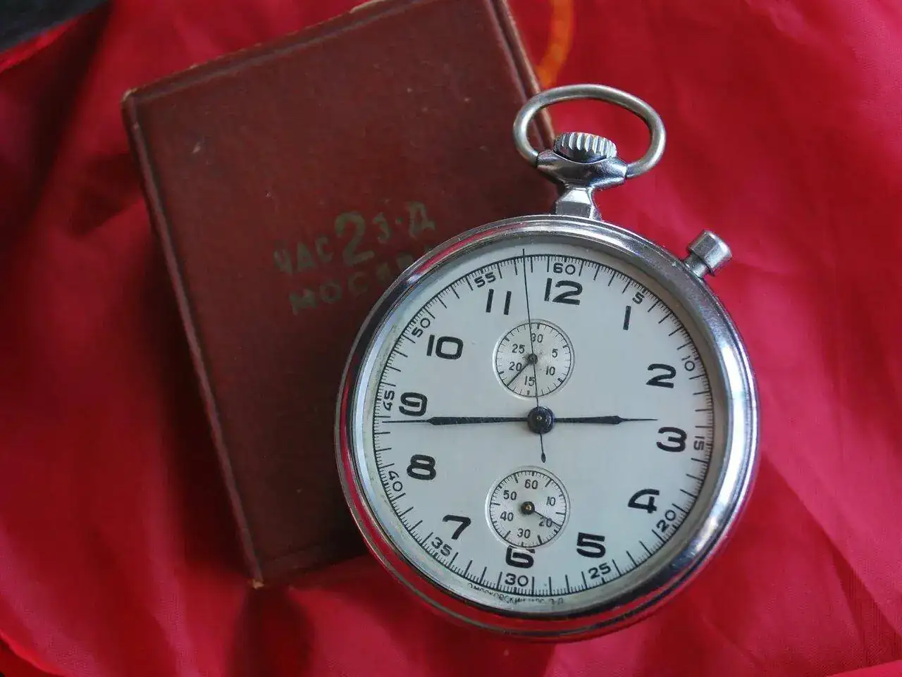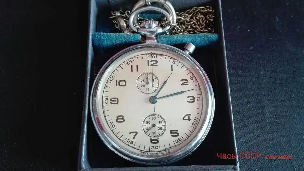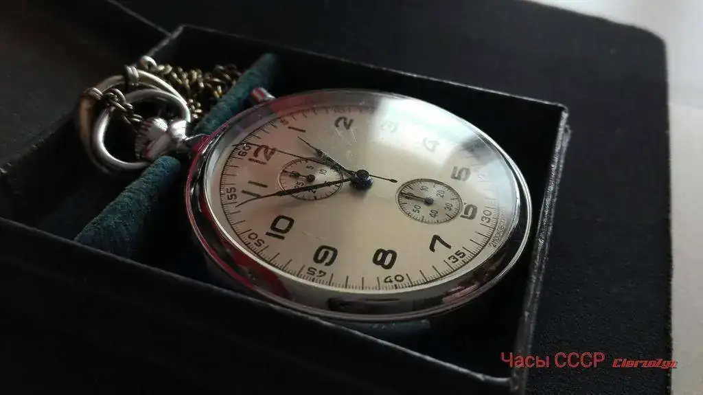 Se trata de un CHK-28, primer calibre cronógrafo (con rueda de pilares) diseñado en la Unión Soviética y producido por la Segunda Fábrica de Relojes. Gracias al marcado del puente, podemos datarlo en el segundo cuatrimestre de 1953. Posteriormente, en los años 60, este calibre pasó a denominarse 3617, y a partir de 1964 el modelo tomó el nombre de Slava. Siendo un cronógrafo de bolsillo, existen algunos ejemplares con asas soldadas, modificación realizada por los pilotos de los MiG. Esta unidad tiene una inscripción en el dial, que lamentablemente han intentado borrar. A mí me gustan ese tipo de marcas, más o menos agraciadas, pero que hacen referencia al uso al que estaba destinado el reloj, o a su propiedad. El reloj marcha muy bien en todas sus funciones, a pesar de su nada desdeñable edad de 69 años.