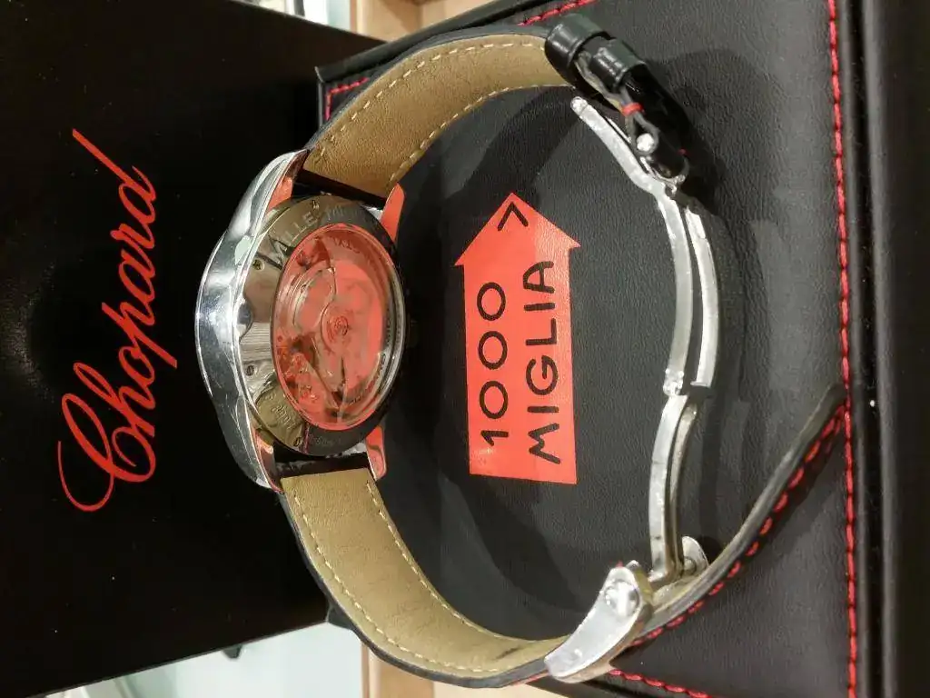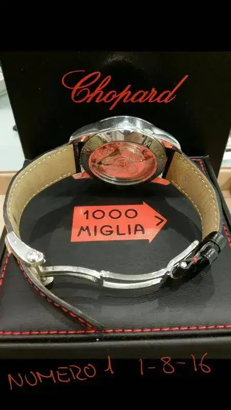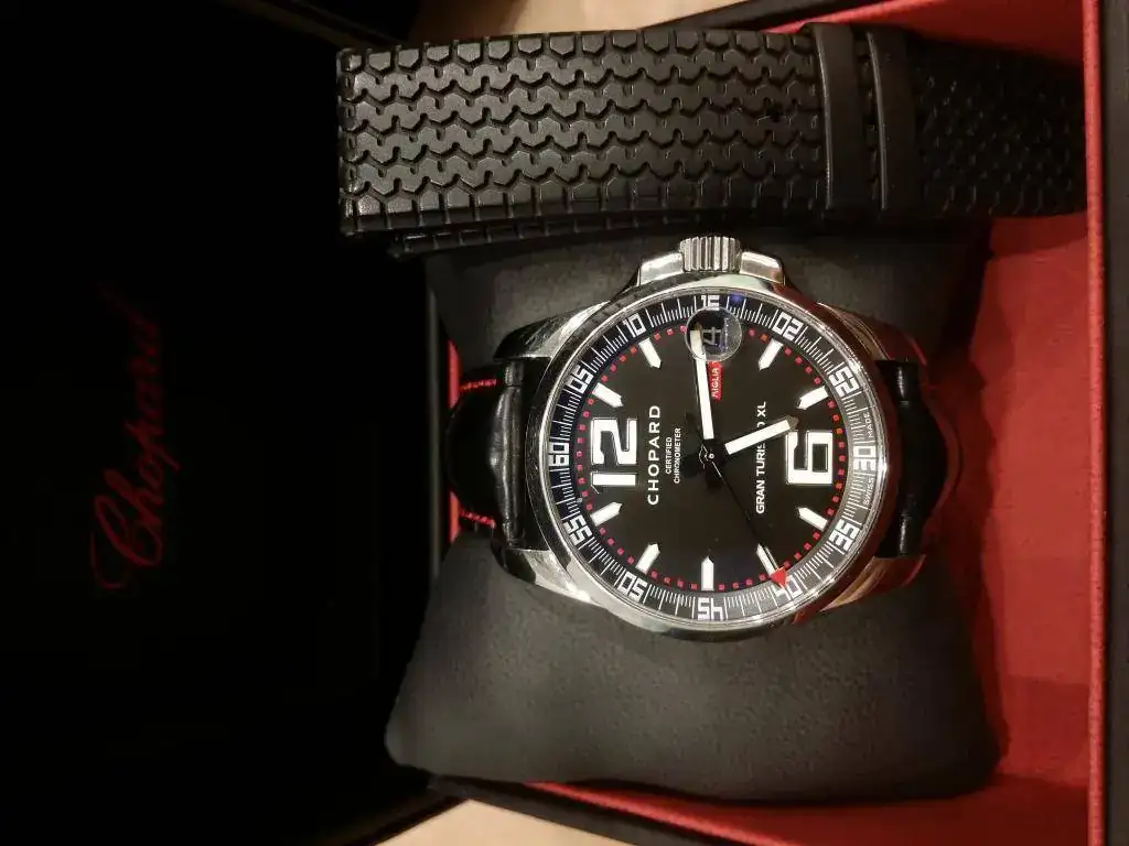 Vendo Chopard GT XL en buen estado sin arañazos y revisión hace 9 meses con caucho y regalo correa a medida en coco negro con pespunte rojo para deployant chopard. Fondo de caja lleva cristal Zafiro con Logo Atlético de Madrid ya que fue de una colaboración de Chopard y Atlético de Madrid.