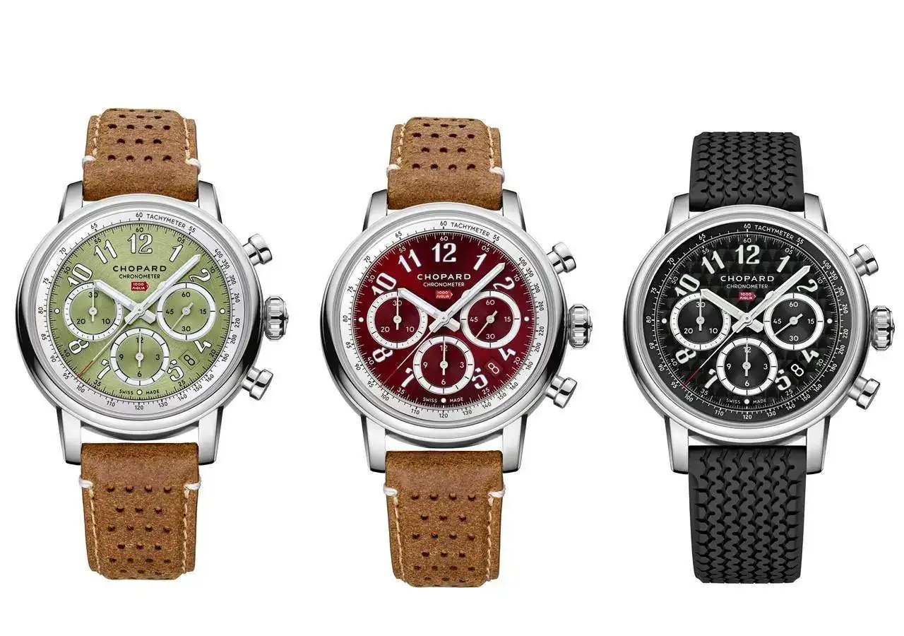 Así, la colección Mille Miglia de Chopard presenta un nuevo diseño del Mille Miglia Classic Chronograph. Este nuevo modelo tiene una caja de 40,5 mm de diámetro fabricada en Lucent Steel, el acero exclusivo de Chopard. La esfera se ha realizado en varios colores inspirados en los de los coches clásicos: los modelos de Lucent Steel presentan unas esferas bautizadas como «Verde Chiaro» (verde claro) y «Rosso Amarena» (rojo cereza) con un acabado satinado circular, o «Nero Corsa» (negro carrera) con acabado bouchonné. En cuanto a lan versión en dos materiales de Lucent Steel y oro ético, posee una esfera satinada «Grigio-Blue» (azul gris).