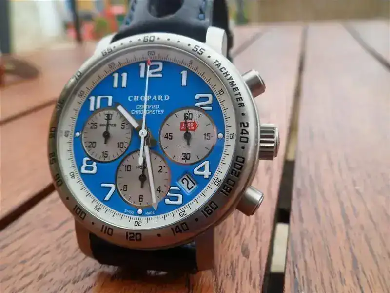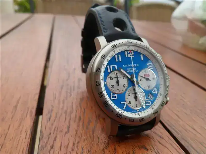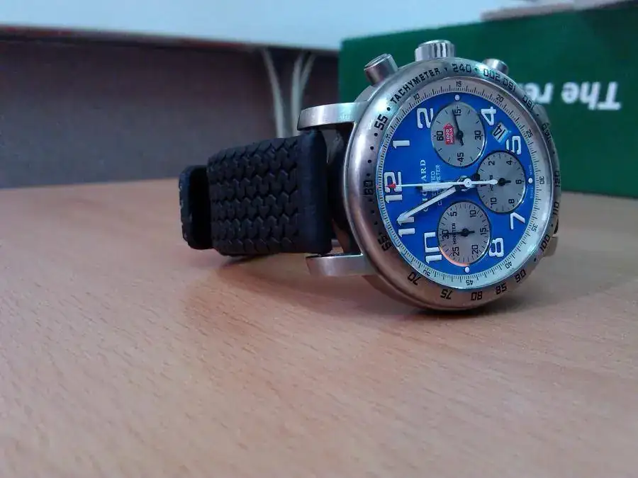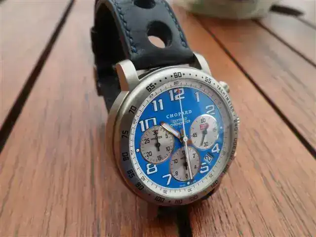 Vendo Chopard Mille Miglia Chronograph Titanium, Ed. Limit. Racing Vintage Blue. En muy buen estado, no hace falta más que ver las fotos, y lo que no se ve en las fotos pero yo si conozco es que la correa, a pesar de ser la original está estropeada. El zafiro está perfecto. No tiene documentación ni cajas, así es como yo lo recibí. Mi relojero de confianza ya lo testó y me dio la bendición para comprarlo en su momento. Mi precio 1450 €. Intentaré contestar a todos los MP.