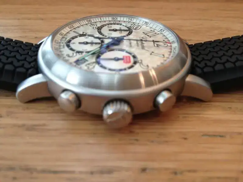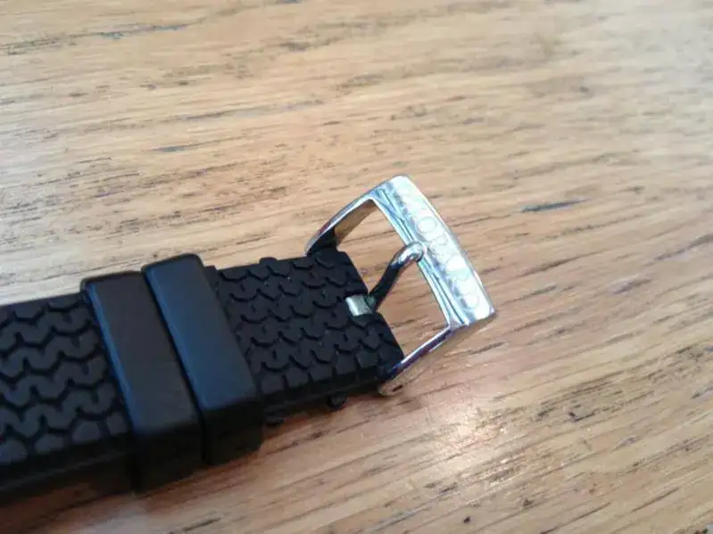 El estado del reloj es perfecto ya que apenas ha tenido puestas, e incluyo una correa extra que le queda muy bien sin estrenar, que se puede ajustar a muñecas de pequeño tamaño, ya que la original simulando un neumático de los años 60 viene con los agujeros para muñecas de tamaño bastante grande.