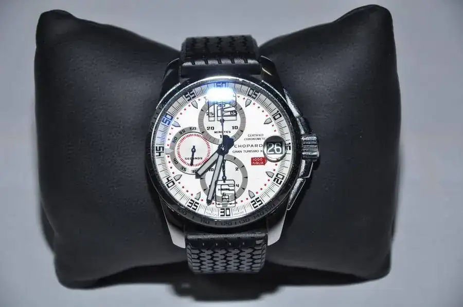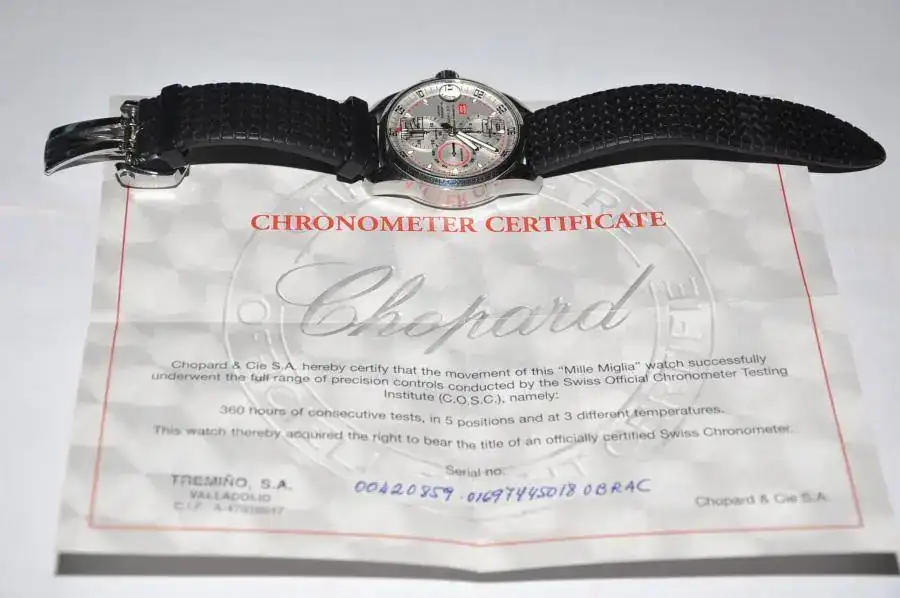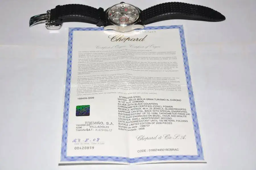 Saco a la venta este impresionante CHOPARD MILLE MIGLIA XL CHRONOGRAPH en un estado impoluto. El reloj ha tenido muy pocas puestas aunque se compró en el 2008 y como se ve en las fotos está casi perfecto (decir perfecto yo no lo diría más que recién salido del servicio oficial). Si sumamos los días que ha estado en la muñeca puesto no creo que llegue a los dos meses.