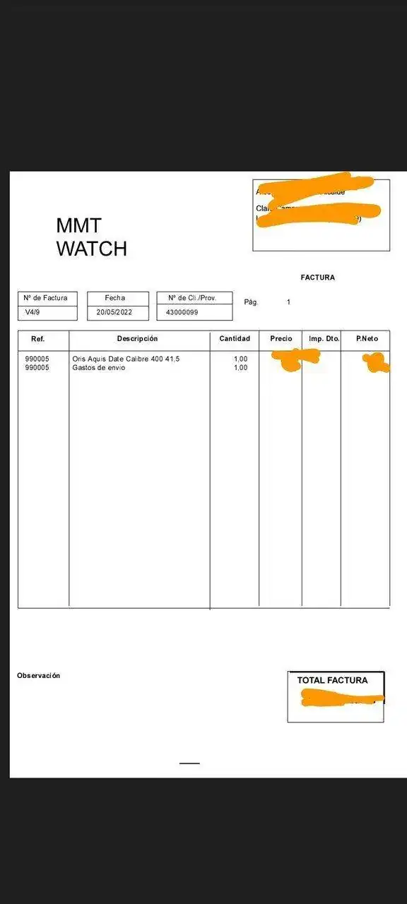 Estoy un poco mosca con Chrono24. Es mi primera compra. El reloj me llegó ayer y todo bien pero sin factura. La pedí al vendedor (MMT Watch) y me manda esta cosa sin IVA, sin CIF, nada... esto no es una factura legal. Os parece normal?