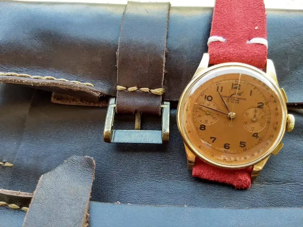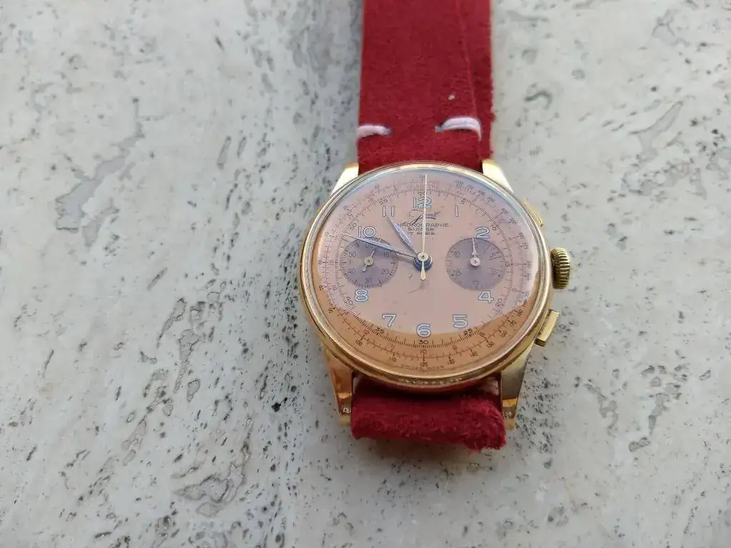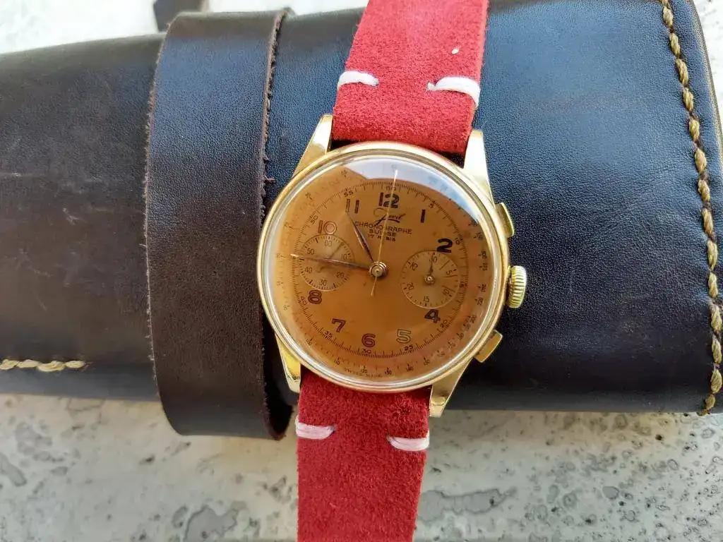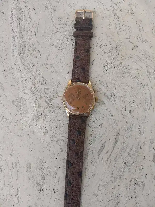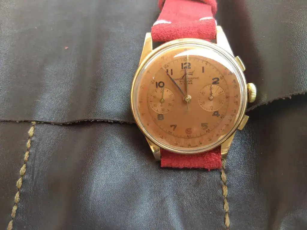 Saco este magnífico cronógrafo suizo en caja de de oro rosa 18k funcionando perfectamente y en un estado de conservación excelente. Es un vintage de los años 50 que ha tenido muy poco uso y se ha cuidado con esmero.
