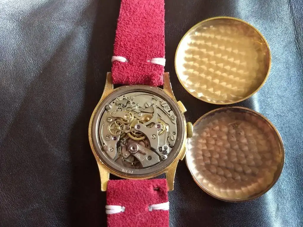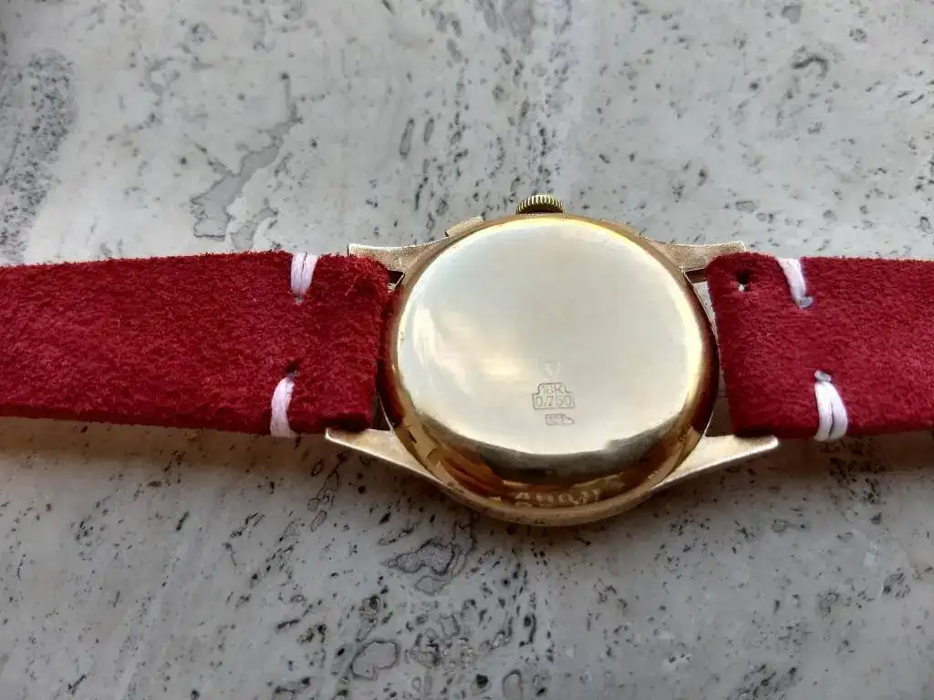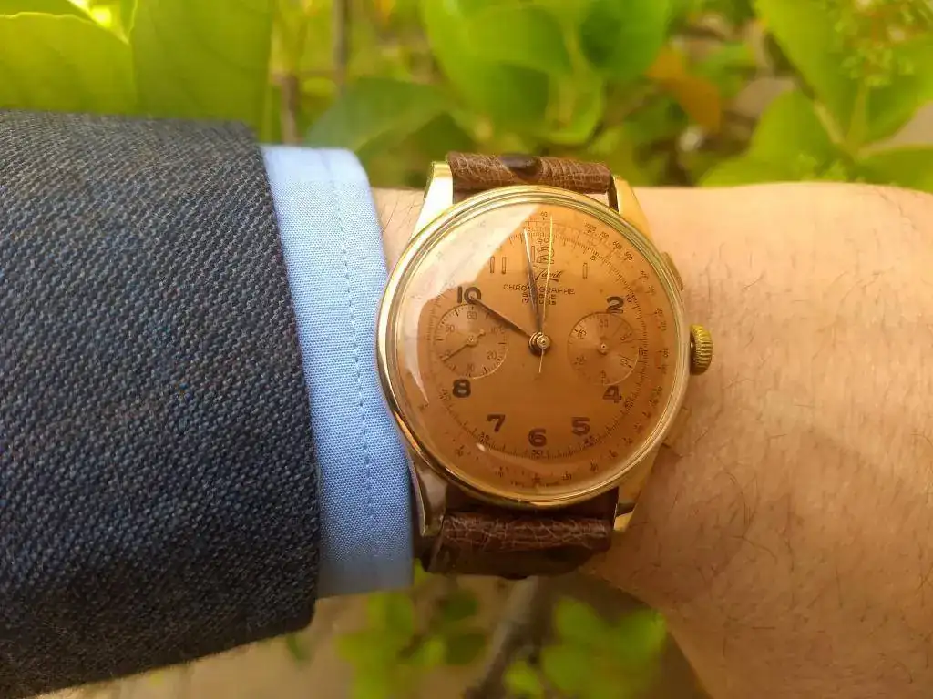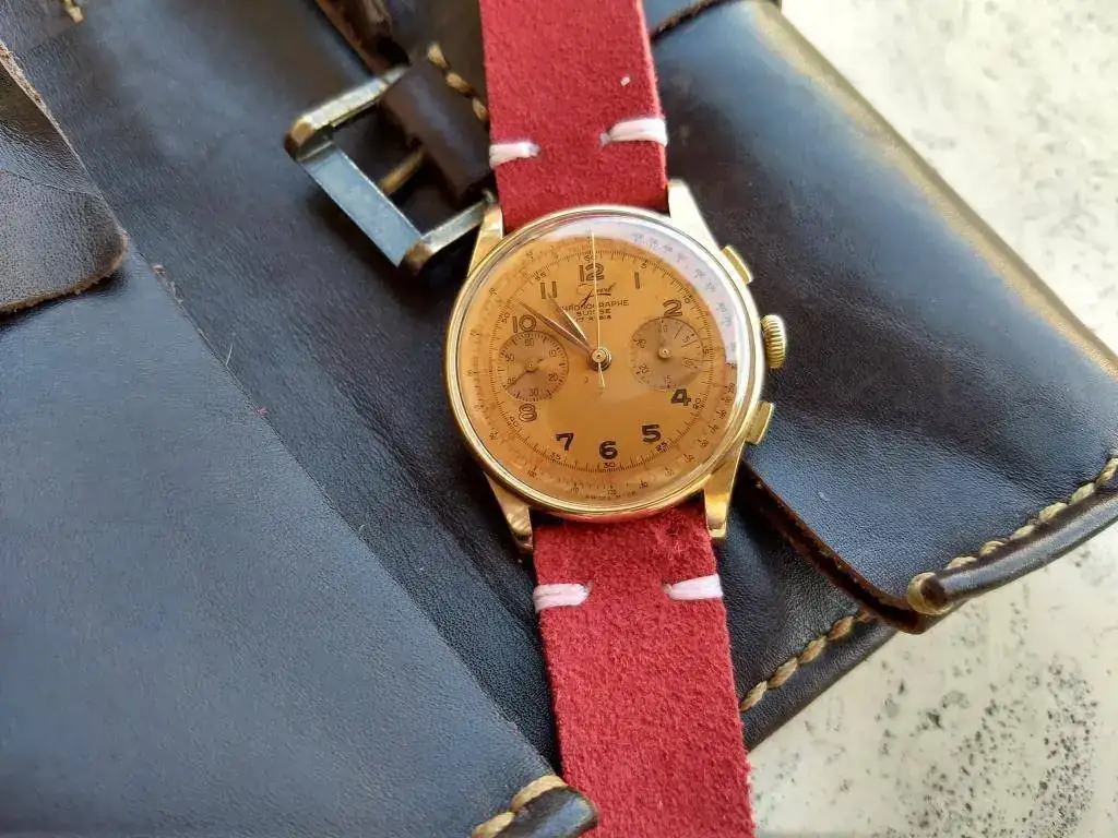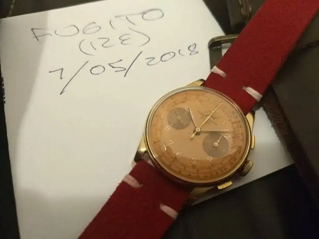 Saco este magnífico cronógrafo suizo en caja de de oro rosa 18k funcionando perfectamente y en un estado de conservación excelente. Es un vintage de los años 50 que ha tenido muy poco uso y se ha cuidado con esmero.