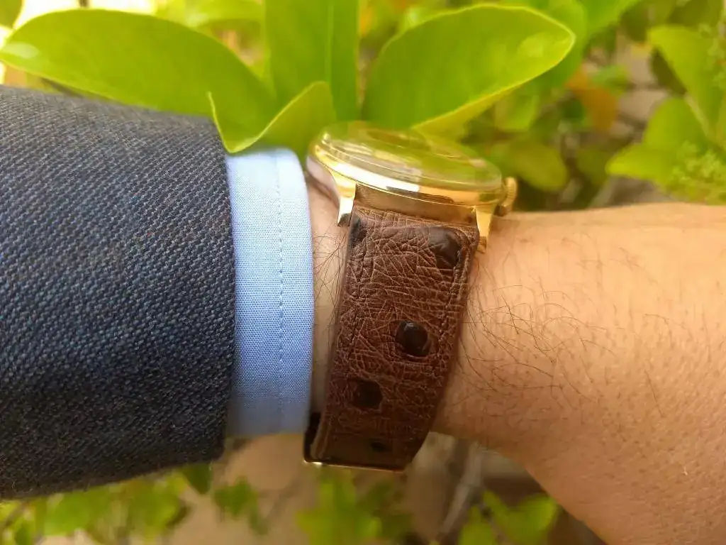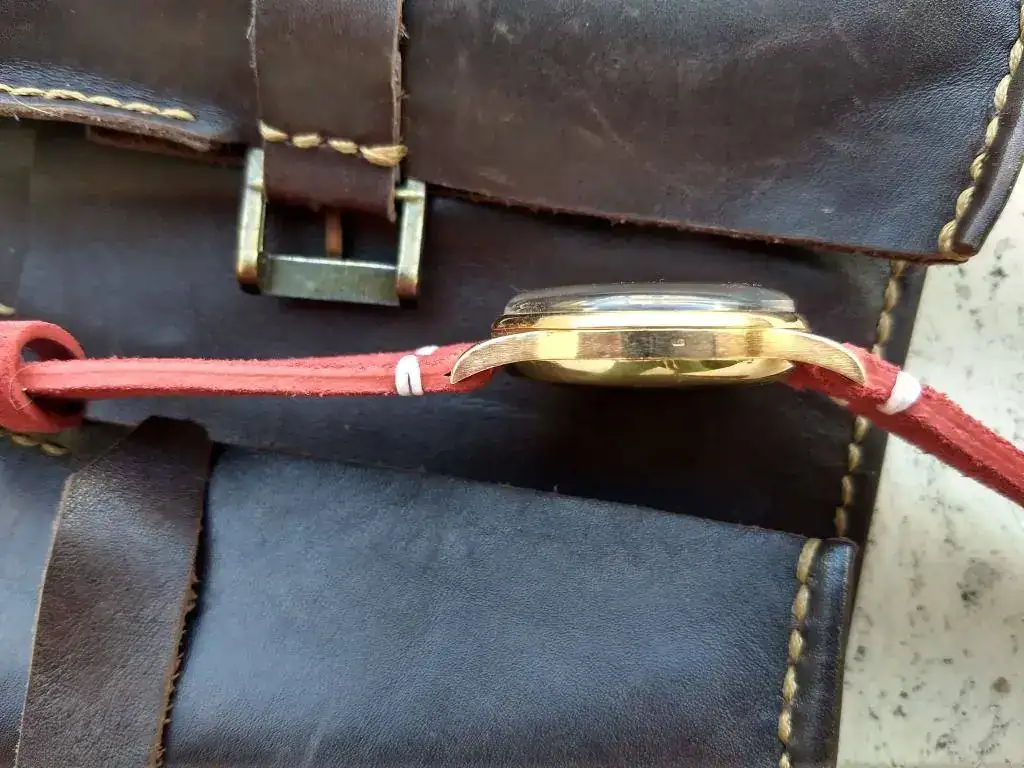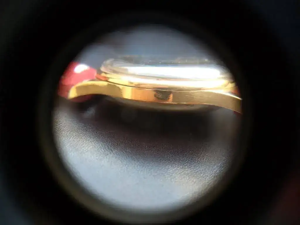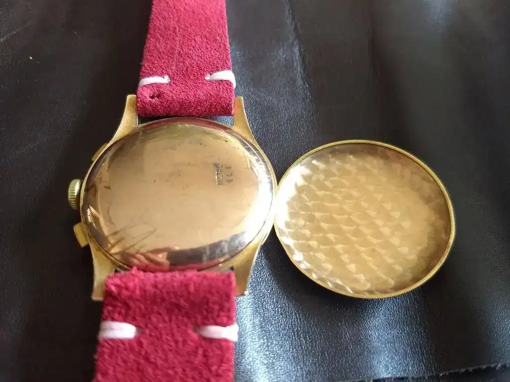 Tanto la esfera, de un tono cobrizo precioso y poco común, como la caja de oro rosa de 18k y tamaño Jumbo (37mm) están en excelente estado, sin marcas ni señales que salten a la vista (en las fotos hay reflejos). Hay que mirar con mucho detenimiento para apreciar los aprox. 60 años que tiene este reloj. Punzones del oro en fotos 7 y 8.