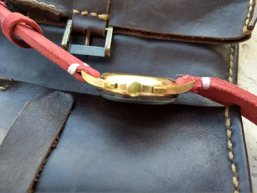 Se entrega con correa artesana de ante rojo Hecha en Suecia a estrenar, que le da un toque sport a este reloj con una presencia en muñeca impresionante. Una correa clásica en piel marrón lo complementaría perfectamente para ocasiones más elegantes.