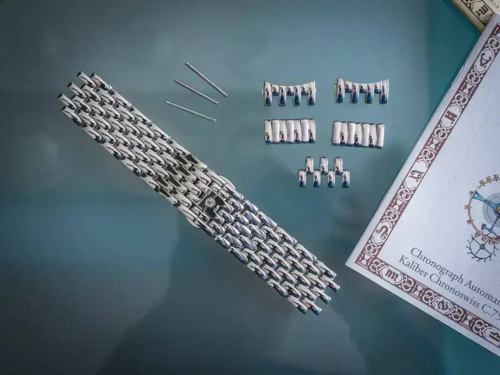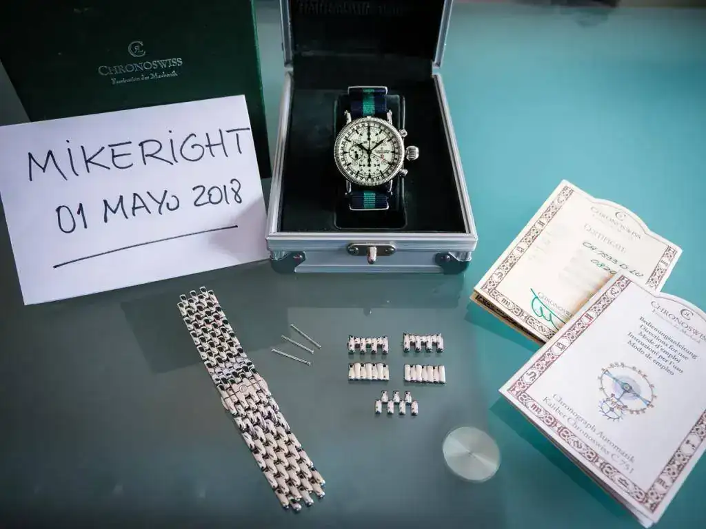 Además de las características ya especificadas y visibles, incorpora el armis original de Chronoswiss. El armis fue ajustado en un taller de prestigio y lo usé unas horas. No me veía con él y se cambió por una correa. Todas las piezas del armis están incluidas.