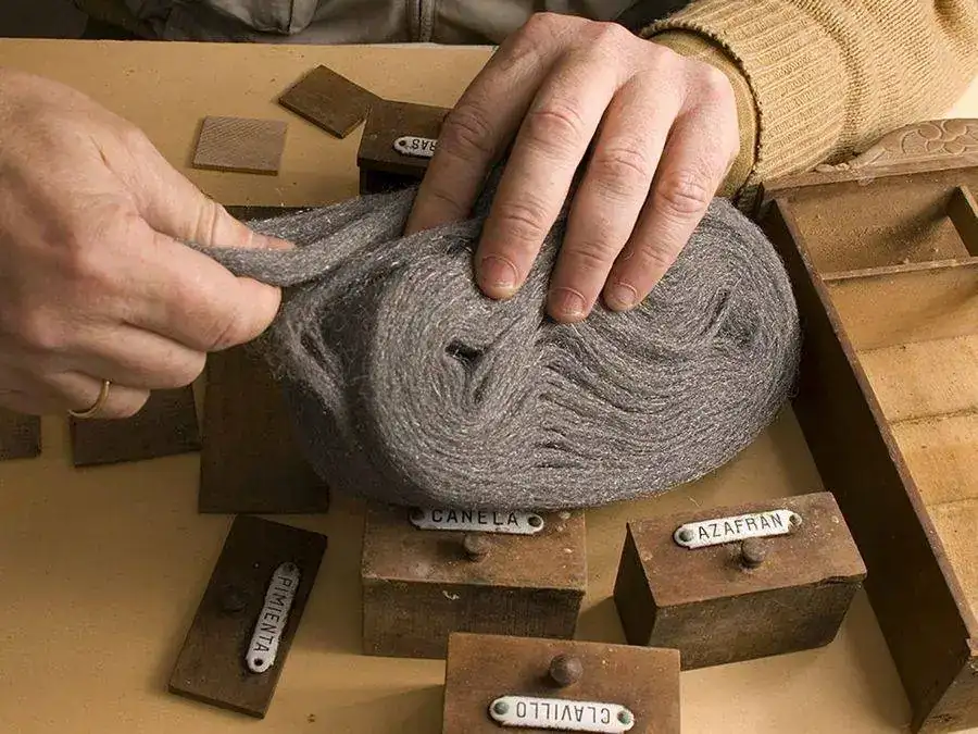Extiende un trozo de la "alfombra" de lana de acero y haz lo mismo que en con el estropajo pero con menos fuerza, esto es para suavizar los micro rayones que ha dejado el estropajo verde.