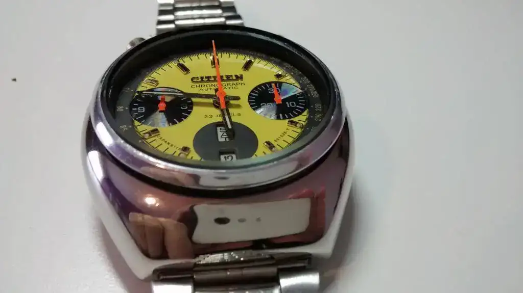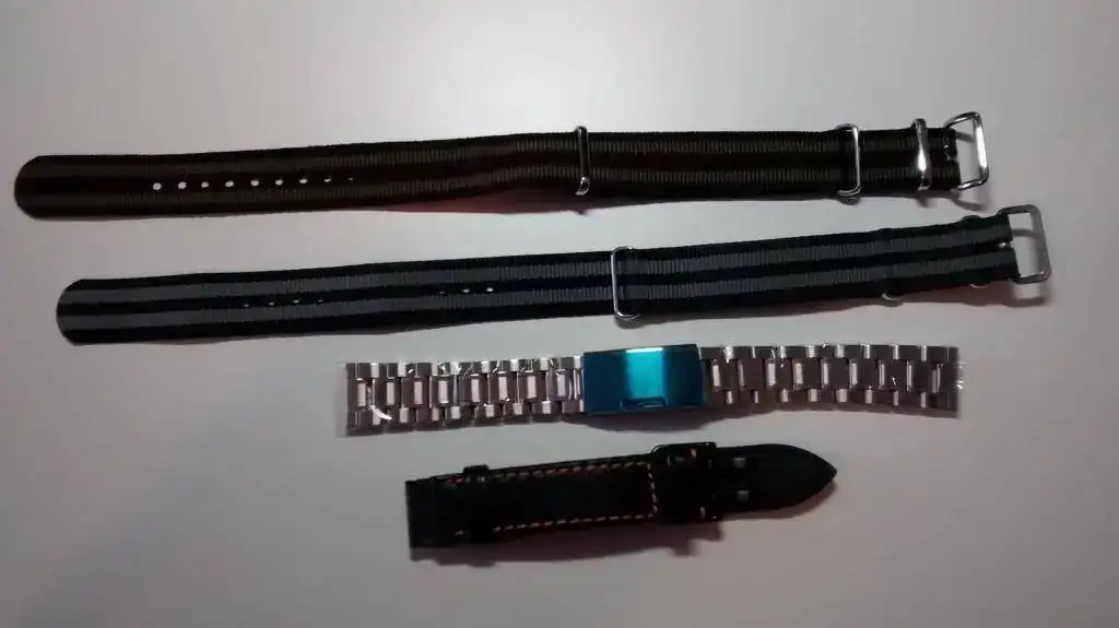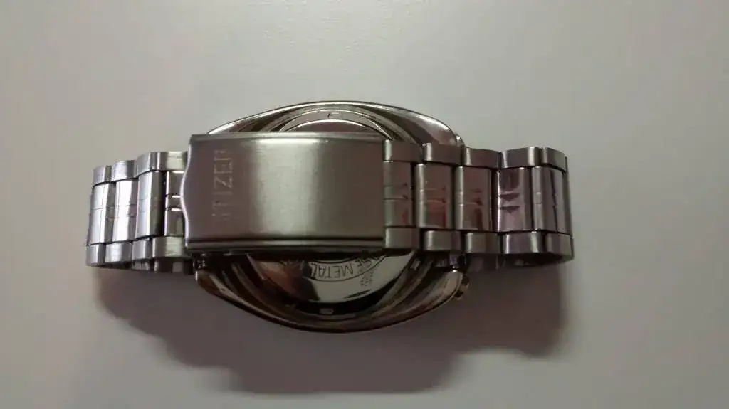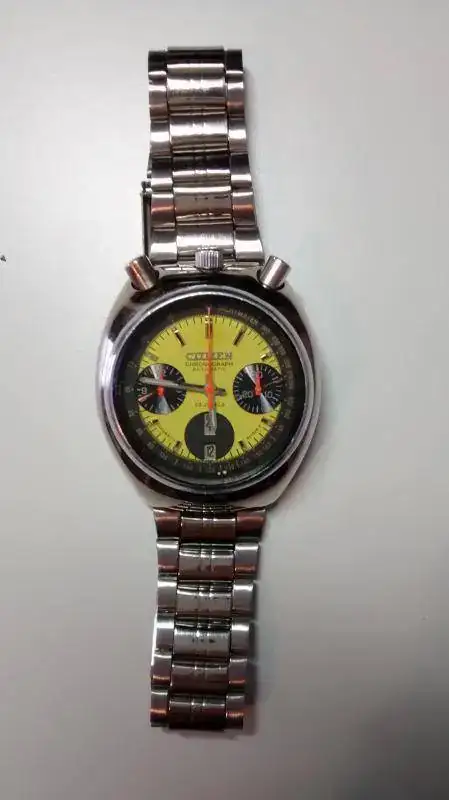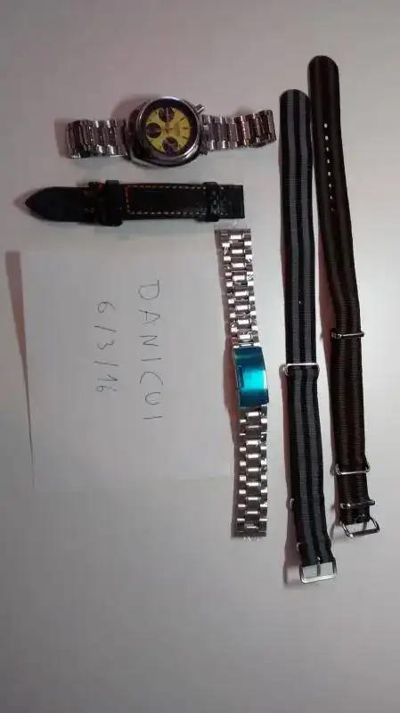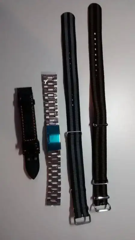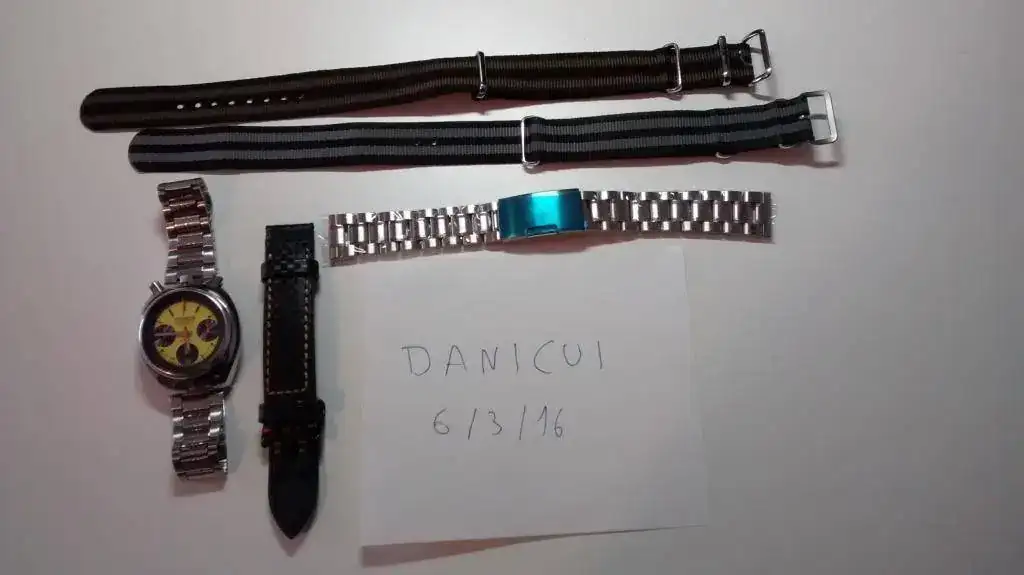 Estéticamente está muy bien, no le veo ninguna marca ni arañazo reseñable más allá de un leve desgaste más que aceptable para un abuelete de casi 40 años. El brazalete es el que venía cuando lo compré (de chapa doblada), es claramente "aftermarket" (el resto de piezas creo que no), da para una muñeca de unos 18 cm o un poco más. Adjunto además las correas que veis en las fotos: un armis metálico genérico macizo con pasadores (sin estrenar, entero, todavía con plásticos), una correa con acabado fibra de carbono con pespunte naranja (usada) y dos NATO (sin apenas nada de uso).