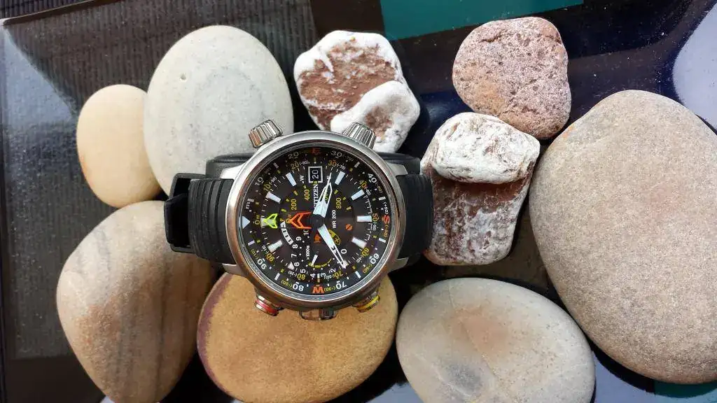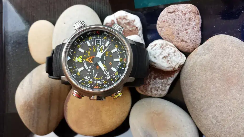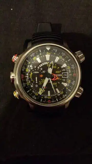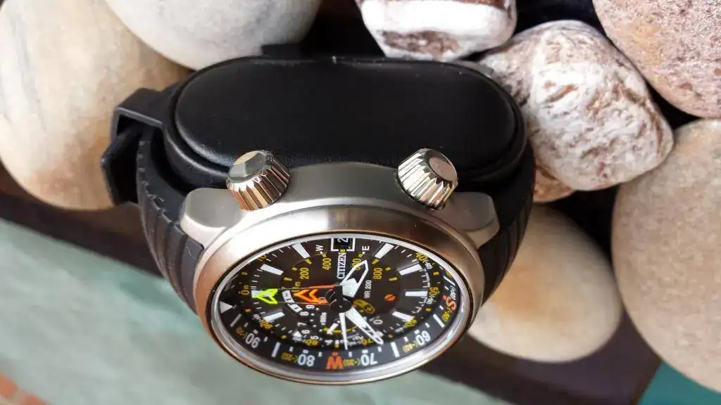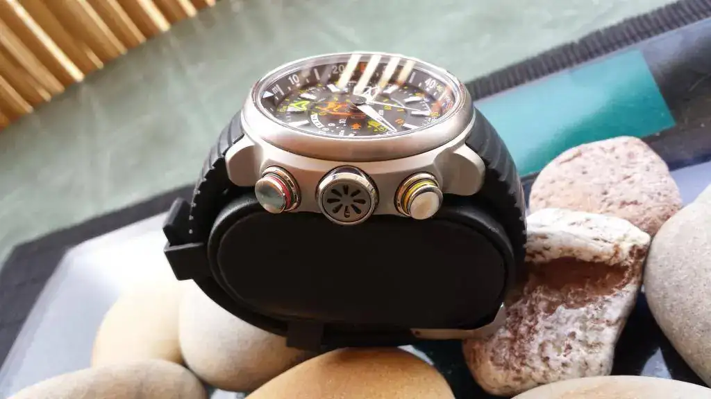 Funciones: Sumergible a 200 m. Altímetro desde -300 a 10.000 metros, con dos agujas indicadores: principal y lad situada en la subesfera 9 horas. Brújula electrónica. Indicador reserva de carga. Calendario.