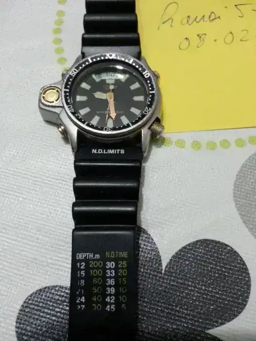 vendo citizen aqualand 1 el botones dorados mas dificil de encontrar es el de tornillos traseros en marcha sin estanqueidad y no va la alarma ( el sonido) tiene algún arañazo en el cristal, el caucho al 90% precio interesante con transporte 165 eu aualand caucho 003.webp