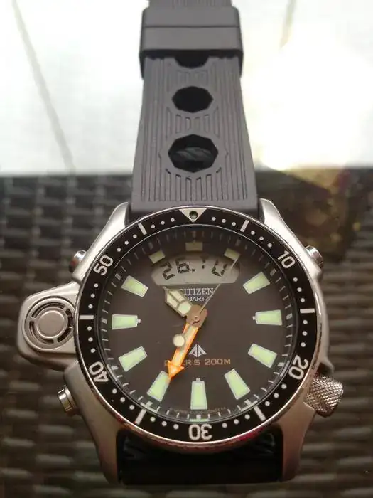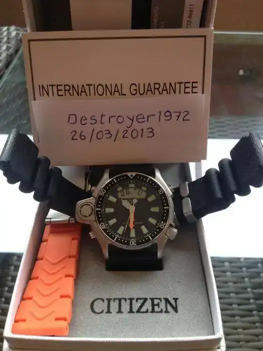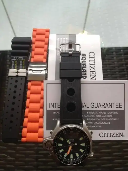 Hola de nuevo, es este caso saco a la venta uno de los relojes miticos de citizen, se trata de la 2ª generacion de este Diver. Su estado es magnifico, tiene muy pocas puestas, solo usado con la correa naranja de silicona, la original la estrena el futuro propietario. Dispone aun de casi 20 meses de garantia, (aunque creo que la marca da un año mas de garantia adicional) sellada el 19/11/2012. Se entrega con la dotacion completa, adicionalmete entrego la correa de silicona, asi como una de caucho de Bonetto Cinturini que tambien esta a estrenar. Para este reloj no quiero cambios, puesto que intento reducir la coleccion. El precio que le pongo al conjunto es de 235 euros. Creo que el precio oficial ronda los 388 euros si mal no recuerdo.