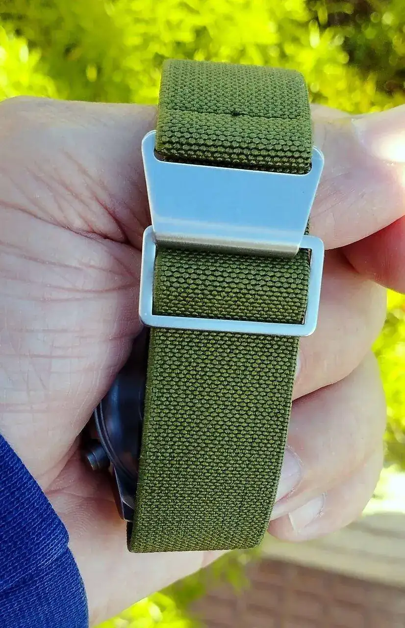 Brazalete: ACERO INOX. y CORREA ELASTICA + ALARGADOR EN ACERO INOX.