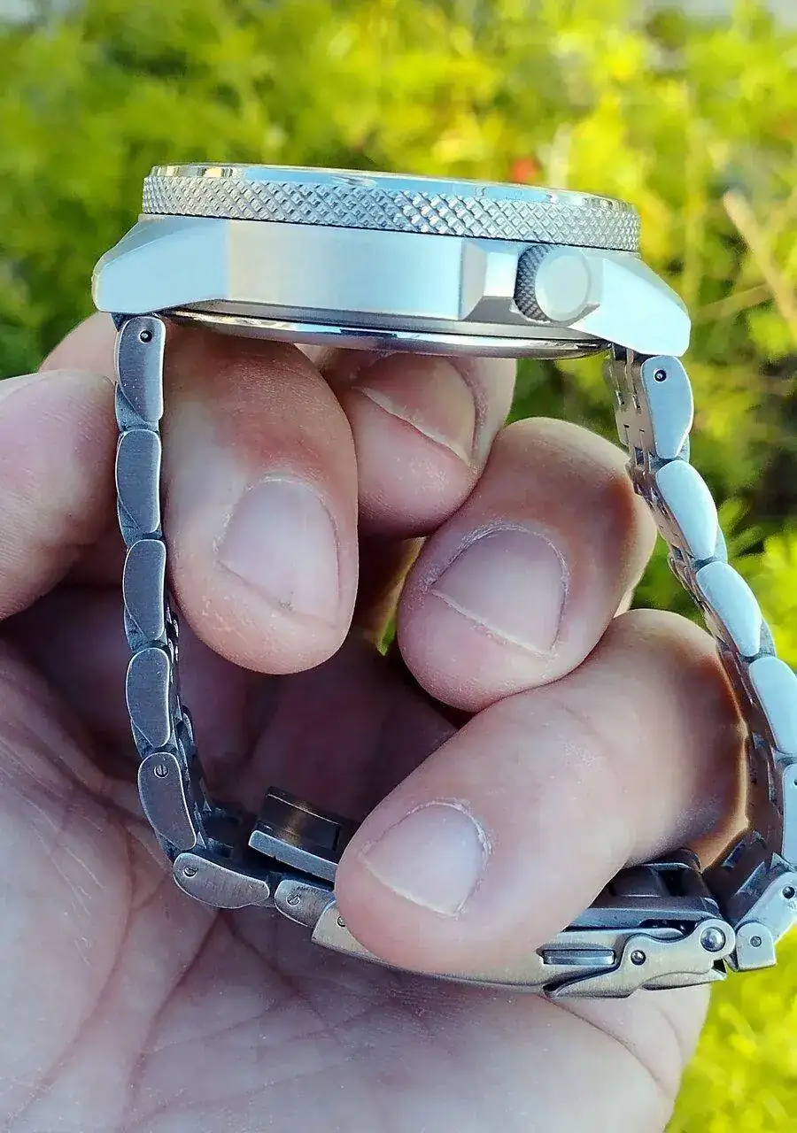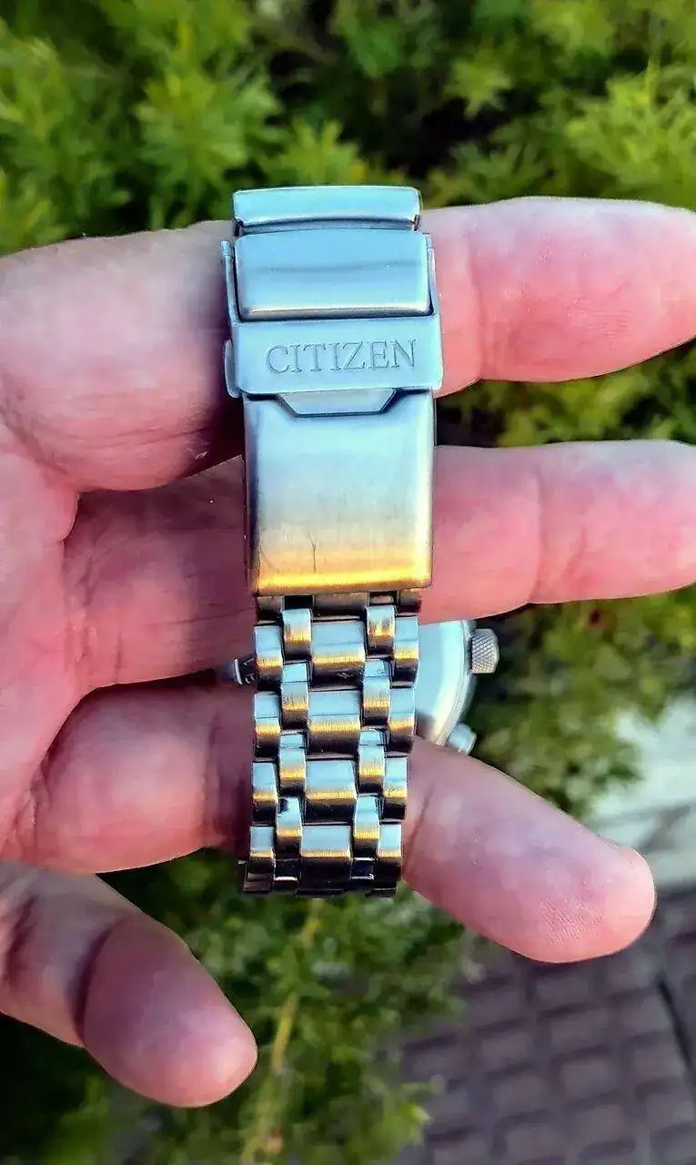 Lo vendo con el brazalete de acero Citizen, a falta de un eslabón (ese eslabón sería necesario para muñecas de más de 19’5cm., que ya es muñeca…), pero en cuenta, hablando con mi relojero, me dio la solución, entrego un accesorio que yo no conocía, un alargador de brazaletes.