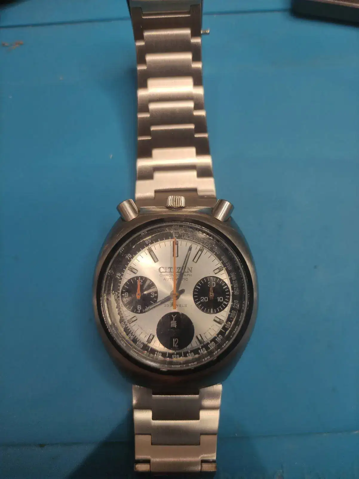 Bueno, quiero presentar el reloj acabado, me ha costado lo suyo dejarlo fino para que el Split se ponga a cero y cuadrar las agujas, el dial está un poco cascado, pero he podido conservar el original, puesto que se parece más bien poco al que compré nuevo.Ver el archivos adjunto 2386324
