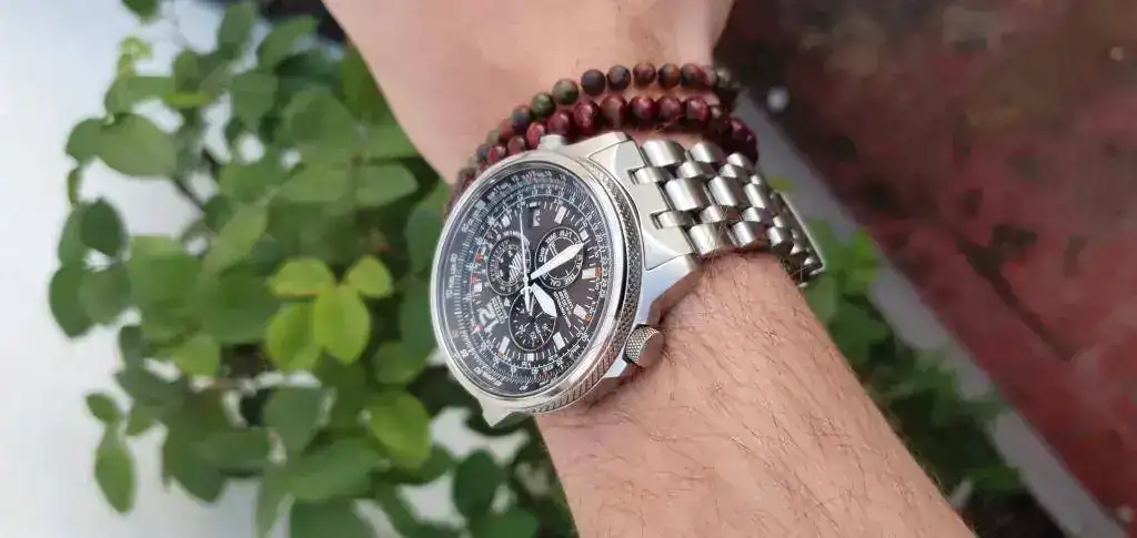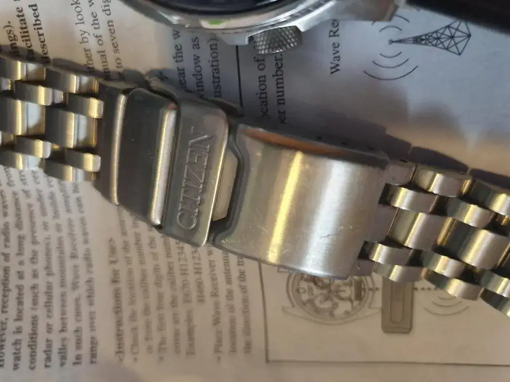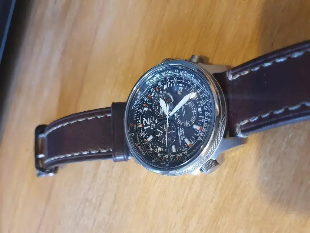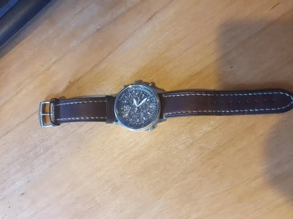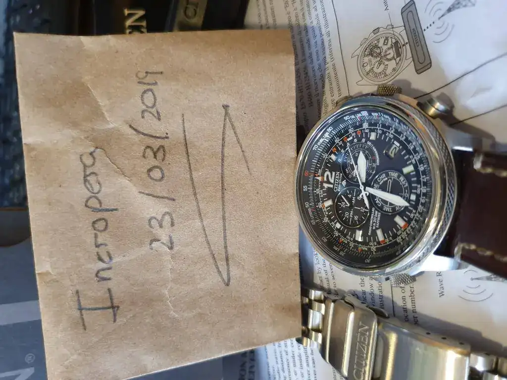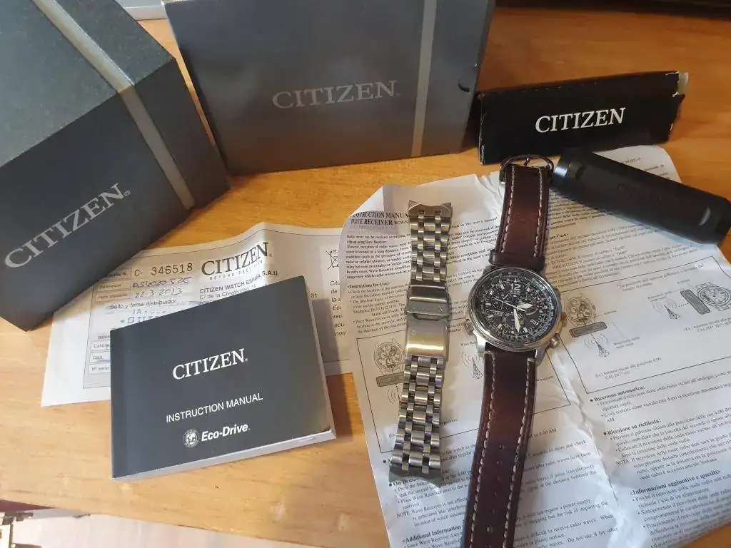 Hola compañeros, me encuentro en pleno proceso de reducción de colección y el próximo candidato a abandonar la caja es este fantástico Citizen Crono Pilot, no se trata de un reloj nuevo perro ha tenido realmente poco uso, no presenta ninguna marca en la carrura y el cristal está perfecto. En cuanto a sus virtudes poco más se le puede pedir: Carga solar Eco-drive con reserva de marcha de 1 año, función de ahorro energético, cronógrafo 1/20 seg, doble uso horario, alarma, calendario perpetuo. Función de recepción de ondas radio con confirmación acústica, visualización del estado de la recepción, impermeable a 200m, zafiro + AR. El reloj va acompañado de toda su documentación, caja original y armis completo con todos sus eslabones (pelillos típicos en cierre que muestro en una de las fotos), como complementos la antena potenciadora de recepción de ondas de radio para zonas de baja cobertura y una Hirsch Liberty marrón con muchísima vida por delante que le queda, a mi juicio, como anillo al dedo.