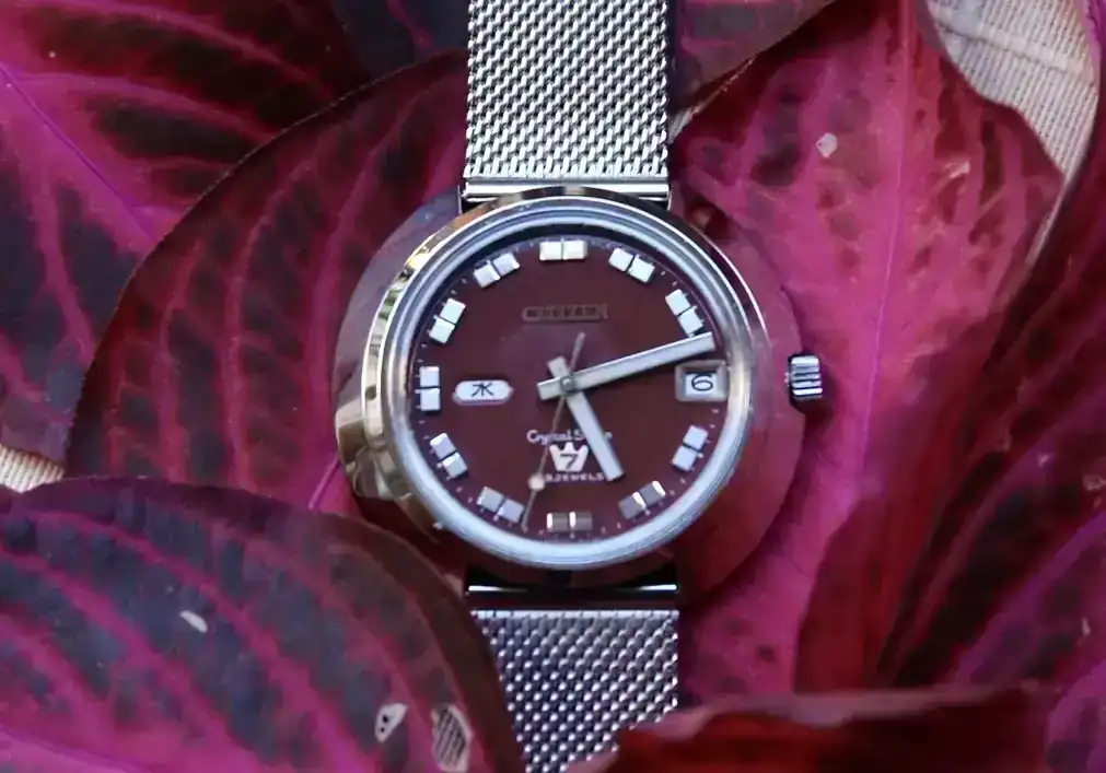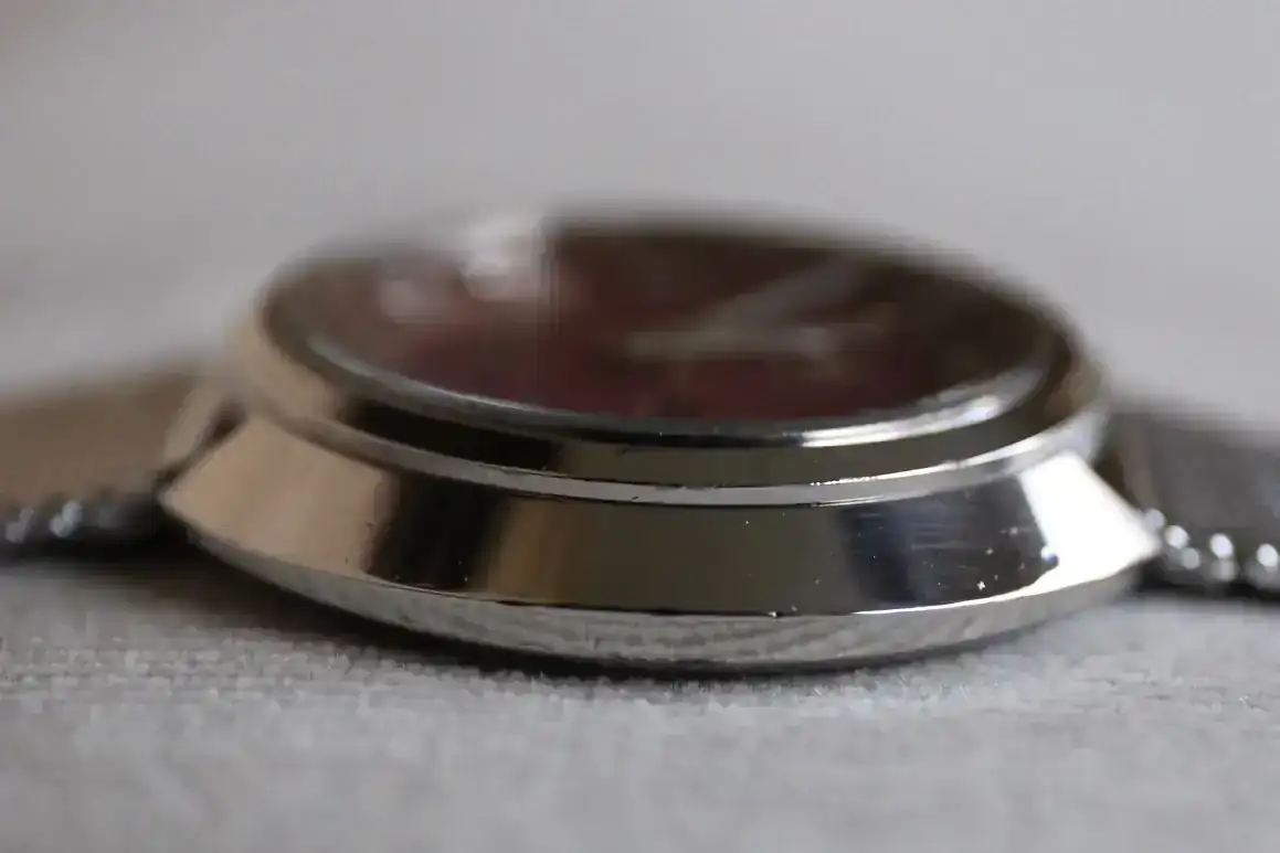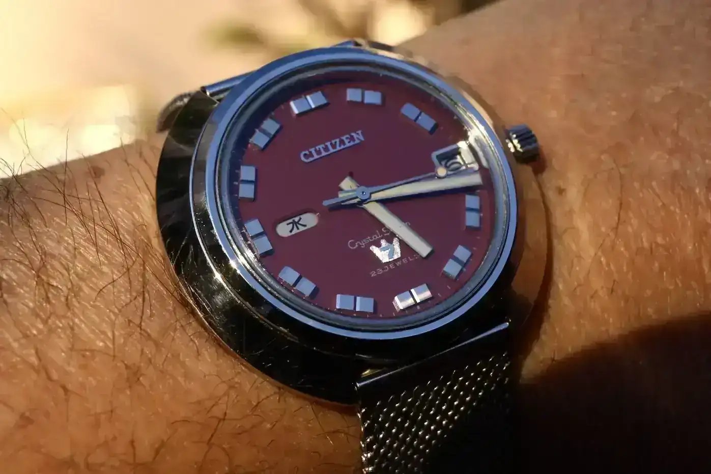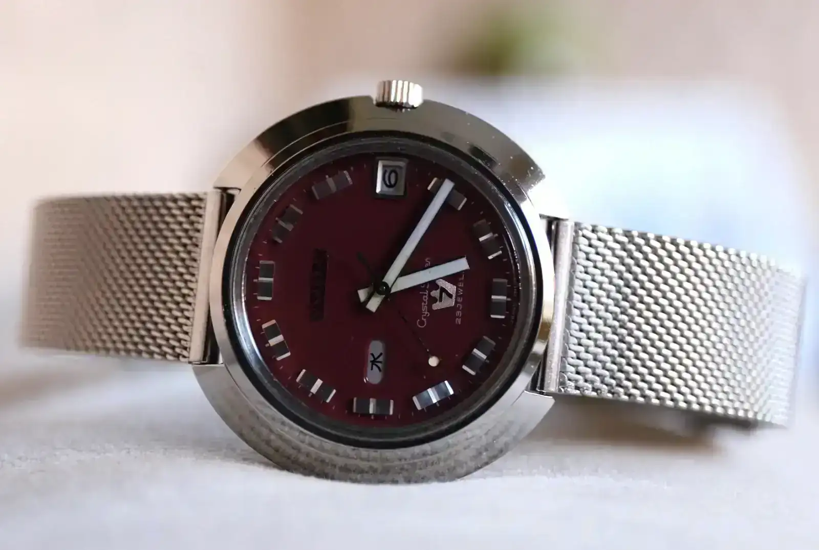El reloj en cuestión es bastante raro , tanto por el color granate tirando a rojo de su esfera como por la ventana a las 9 del dia de la semana en inglés y japonés ( este último debido a que es del mercado nipon ).