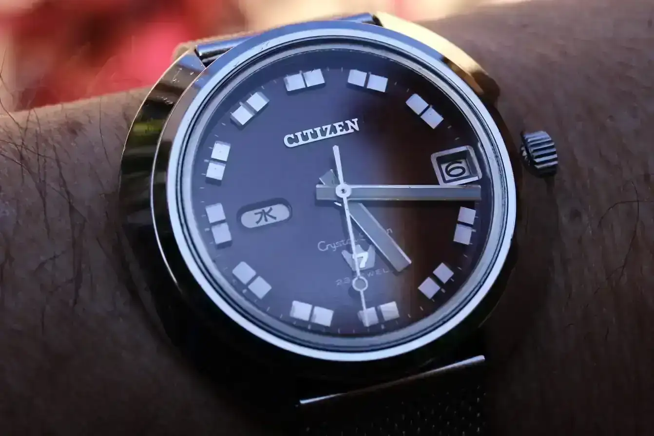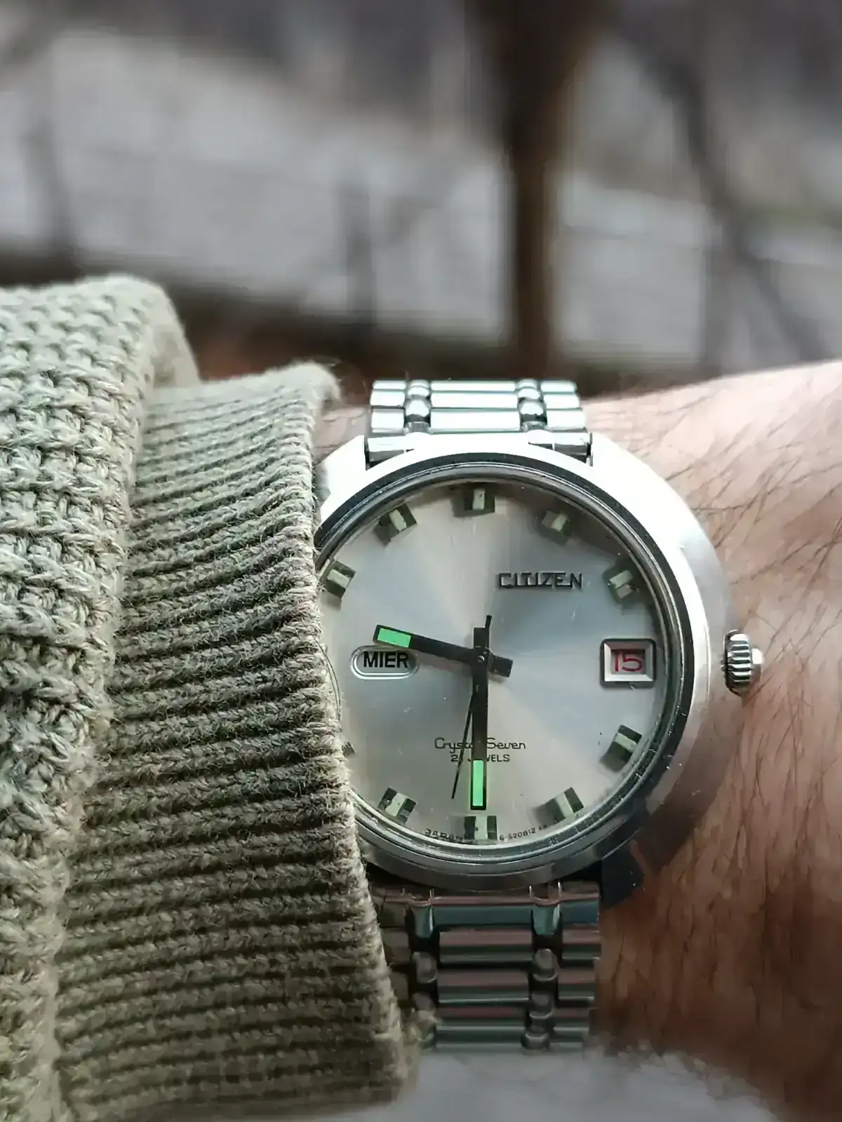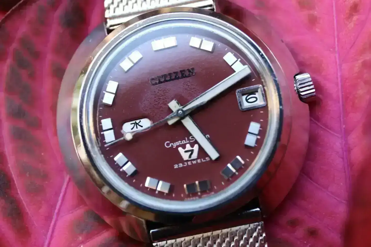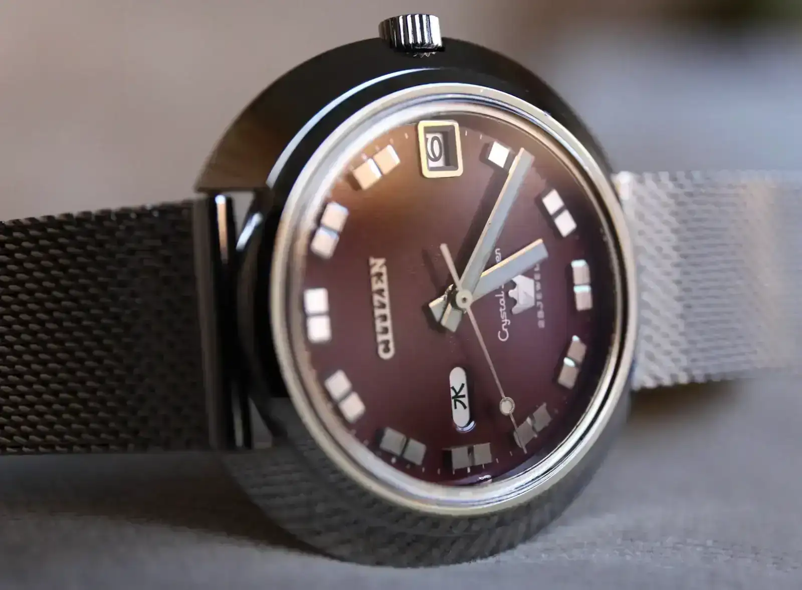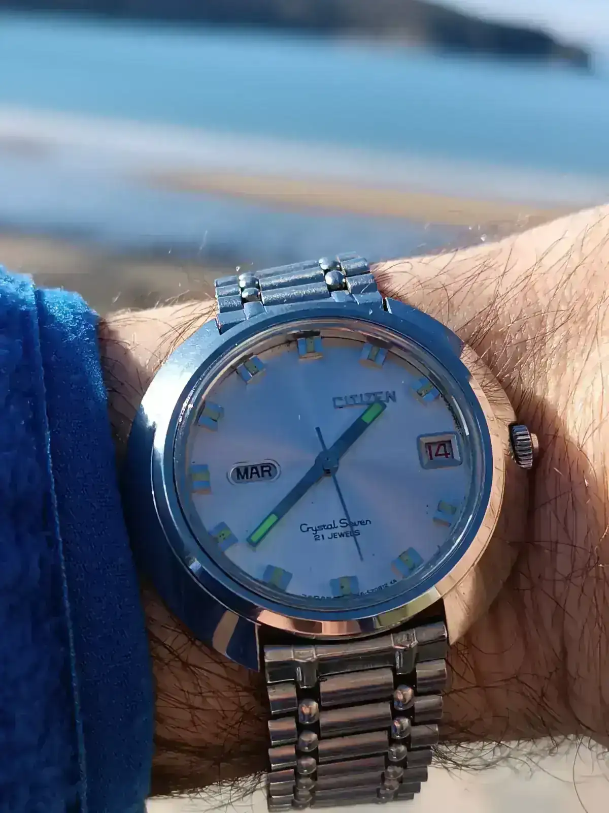 Ahora vamos a la pequeña historia curiosa . Resulta que en esa época lo más de lo más era el plástico, y los fabricantes colocaban plexis a los relojes en lugar de los cristales minerales. Pues Citizen, en esta gama, hizo una apuesta por el cristal mineral, creando un nuevo tipo de cristal de borosilicato, por lo visto más difícil de rayar, la verdad es que está estupendo sin ninguna raya . El nuevo cristal se llamaba BK7, de ahí lo de "Crystal Seven".