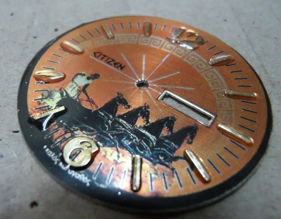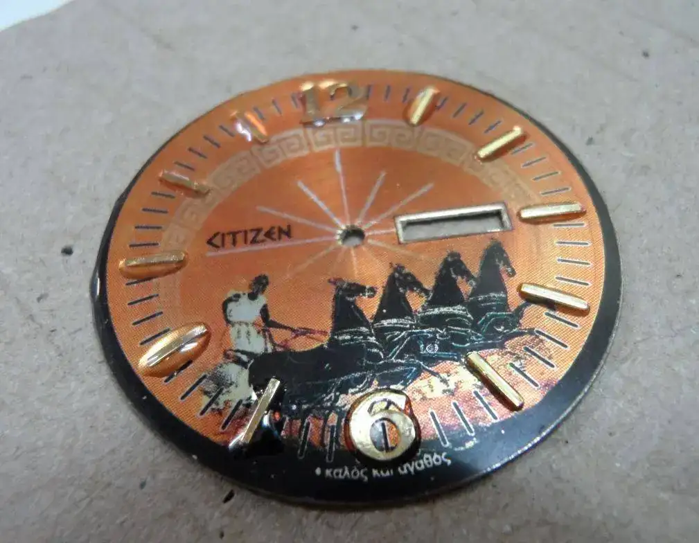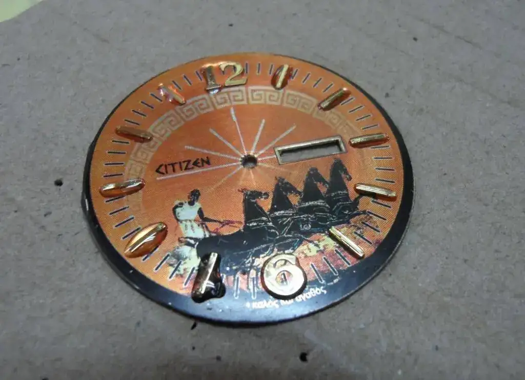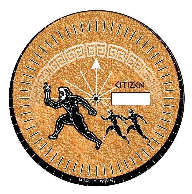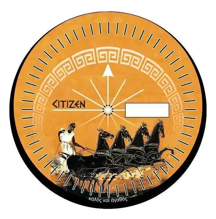 Le hice una decoración con una orla típica griega y cambié la tipografía del logo citizen por una tipografía antigua utilizando el tipo Papirus, y añadí una circunsferencia con el minutero en el exterior del dial.