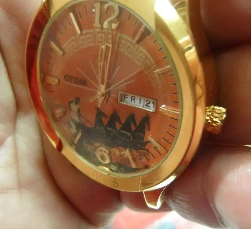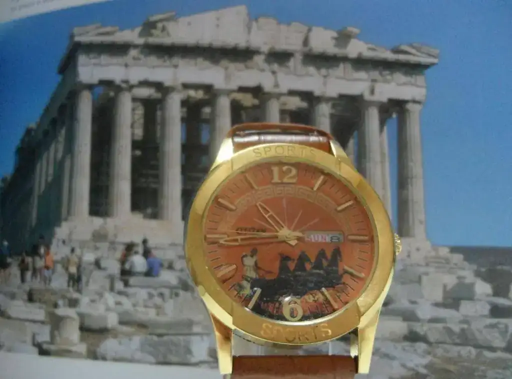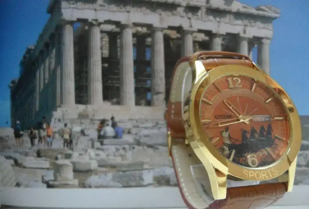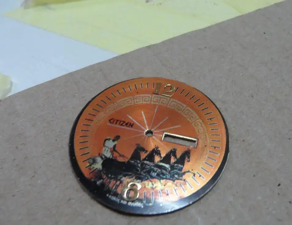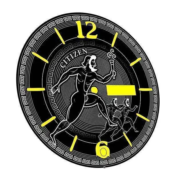 Le hice una decoración con una orla típica griega y cambié la tipografía del logo citizen por una tipografía antigua utilizando el tipo Papirus, y añadí una circunsferencia con el minutero en el exterior del dial.
