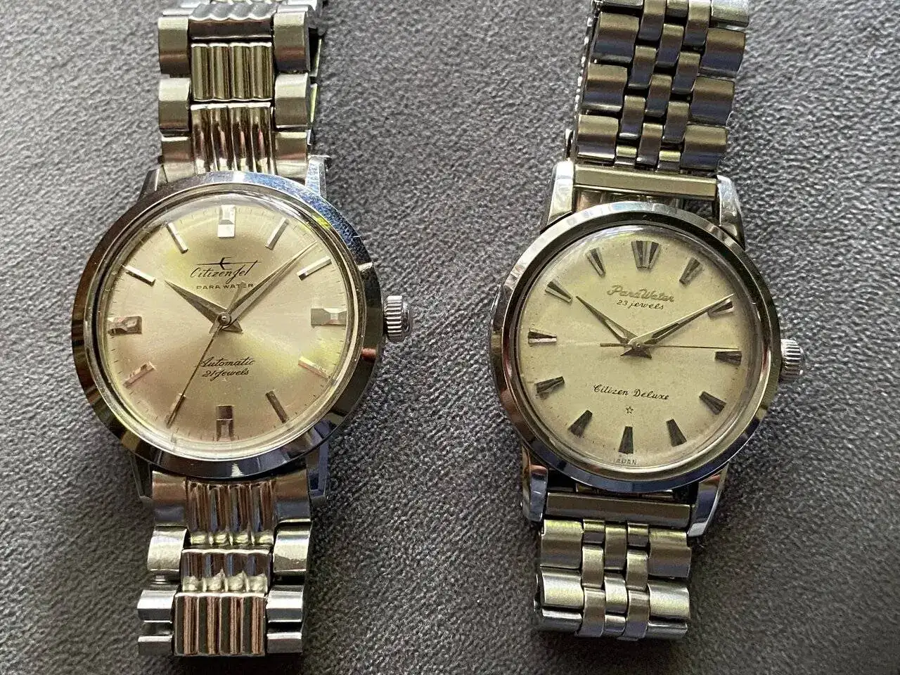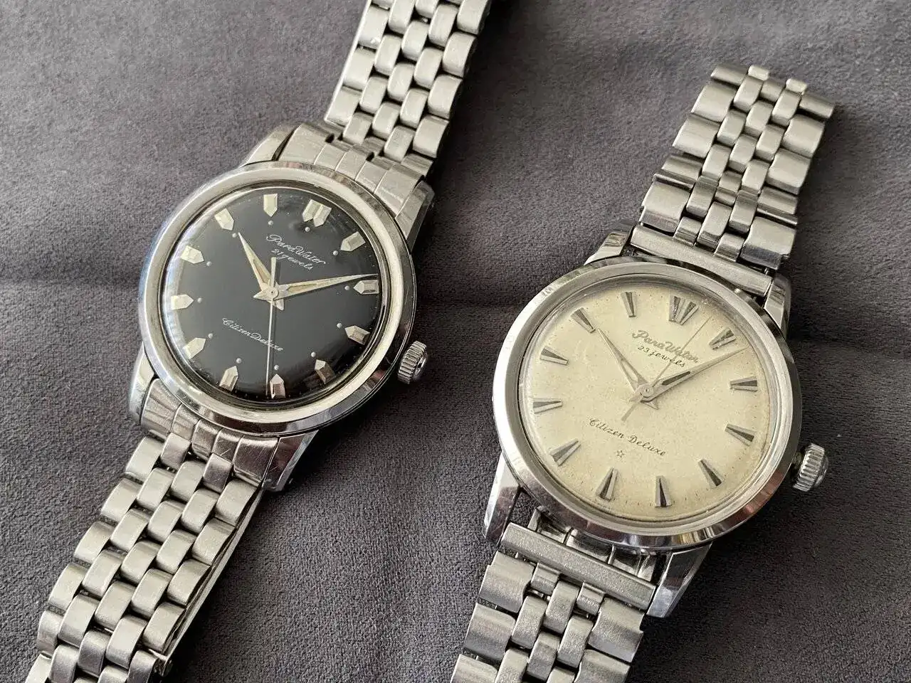 Estos dos relojes se fabricaron en enero (el de esfera blanca) y noviembre (el de esfera negra) de 1960. Son por tanto de los primeros «ParaWater», como prueba también el lugar de privilegio que ocupa la denominación de esa función, que se resalta bajo el índice de las doce. Debajo de las doce se hace referencia también a los rubíes («jewels»), 23 el de esfera blanca y 21 el de la esfera negra. Encima de las seis aparecen ya los nombres de la marca y de la colección a la que pertenecen: Citizen Deluxe. Además, el de esfera blanca añade debajo el logo de una estrella.