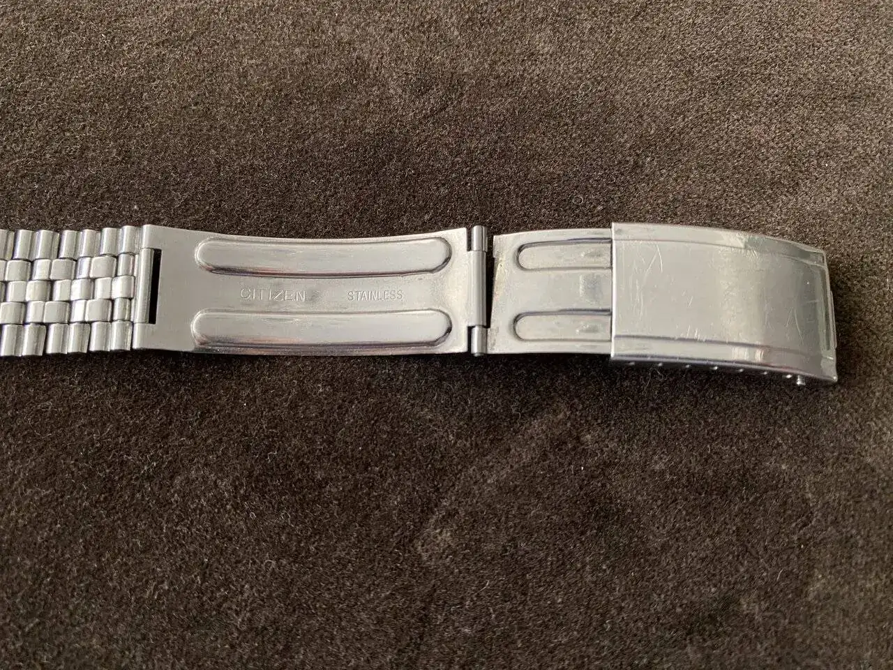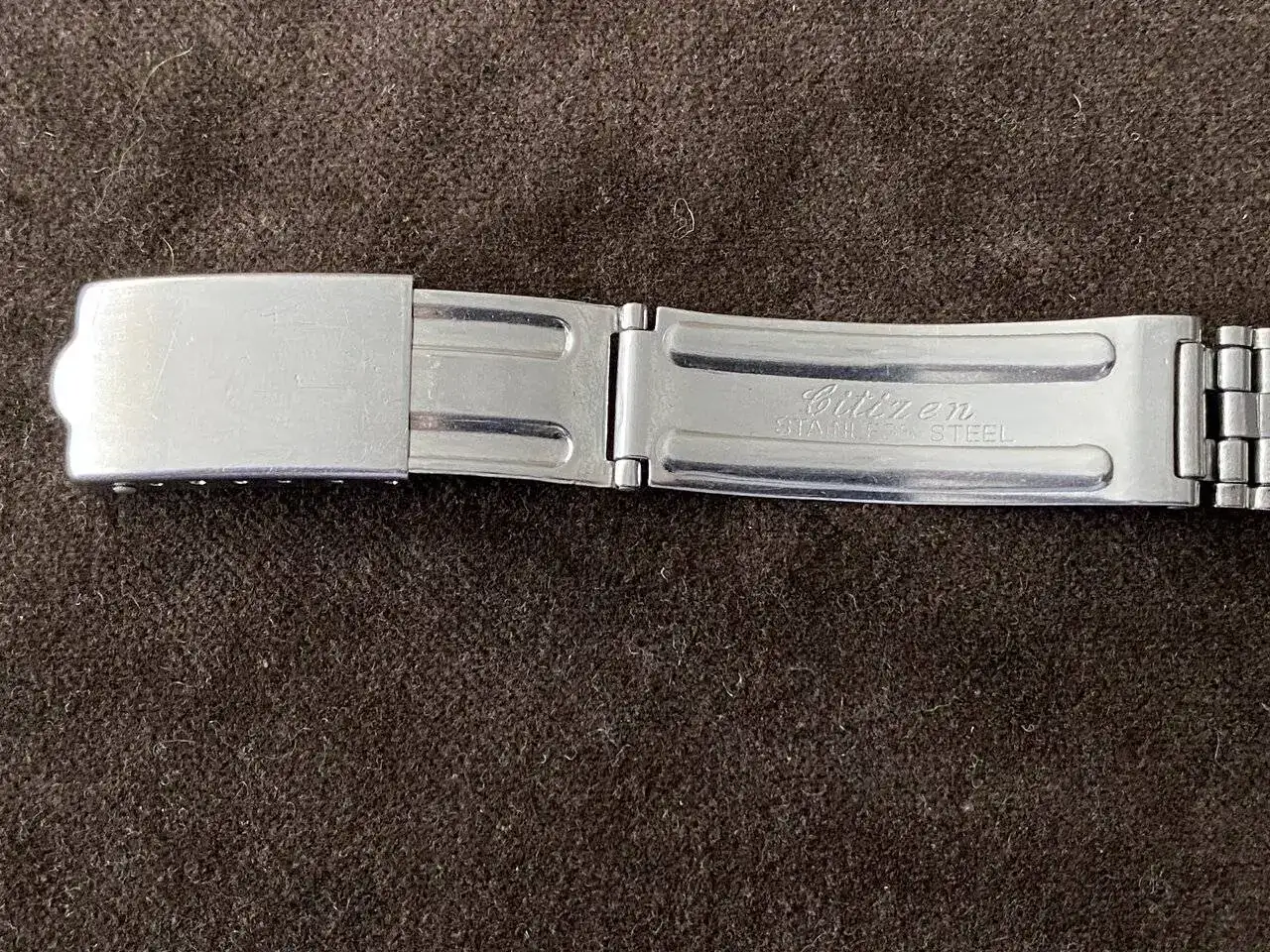 Ambos Deluxe Parawater venían con brazalete de acero inoxidable firmado «Citizen» en el cierre, pero no puedo saber si son los originales o no. En todo caso, parecen de la época y me gusta que lleven brazaletes metálicos en lugar de correas, ya que los brazaletes proporcionan un aire más de época. El brazalete que acompaña al negro incorpora además los eslabones terminales curvos pegados a la caja, por lo que tiene mejor presencia que el de esfera blanca. Las coronas, ninguna de las dos firmada, son originales, ambas estriadas y con un saliente redondo. Son fáciles de manipular, lo que se agradece al tratarse de relojes de cuerda.