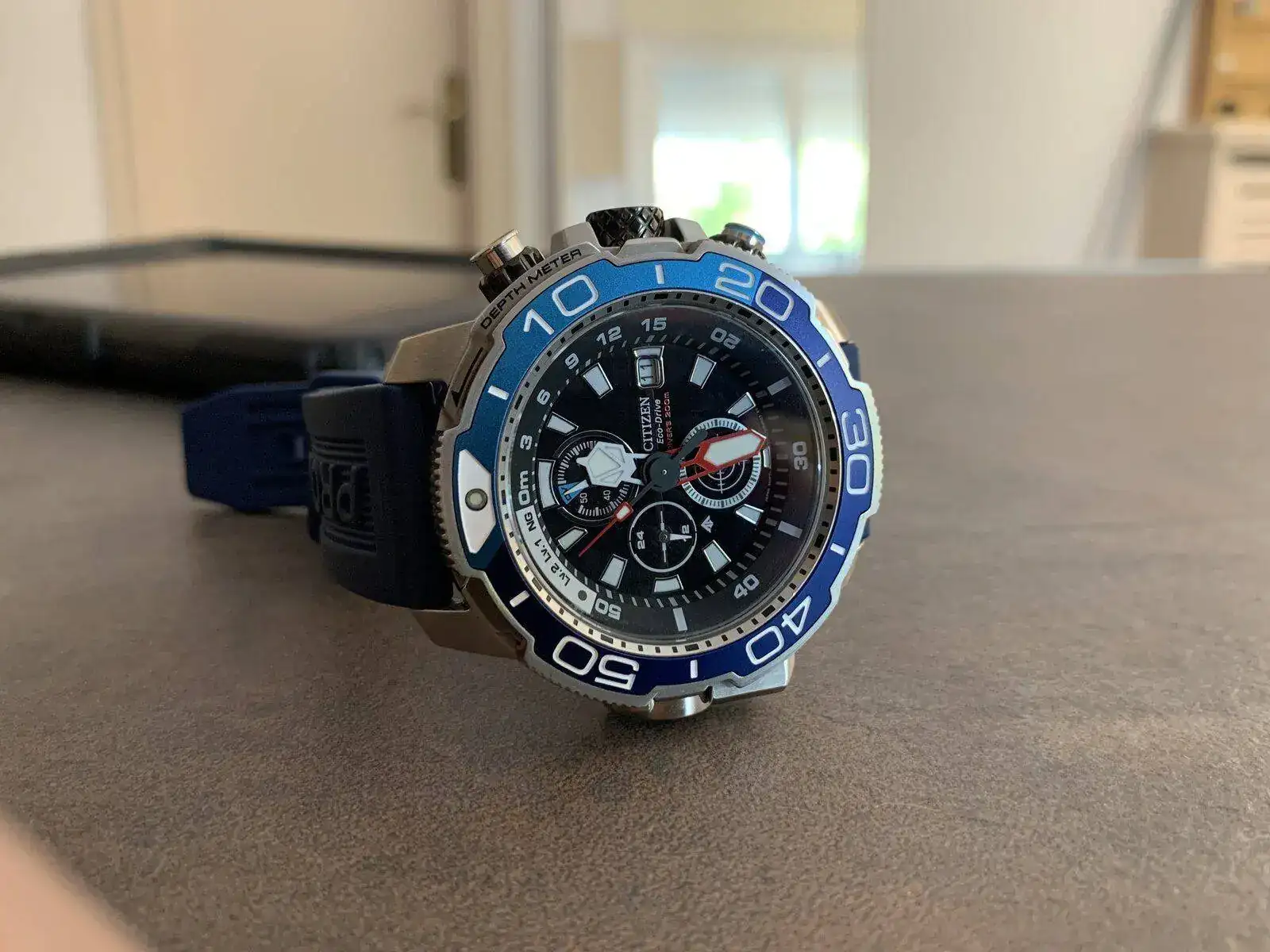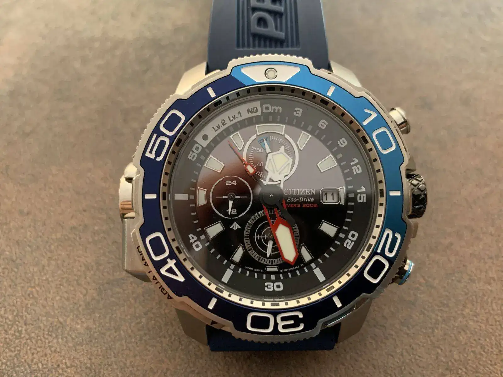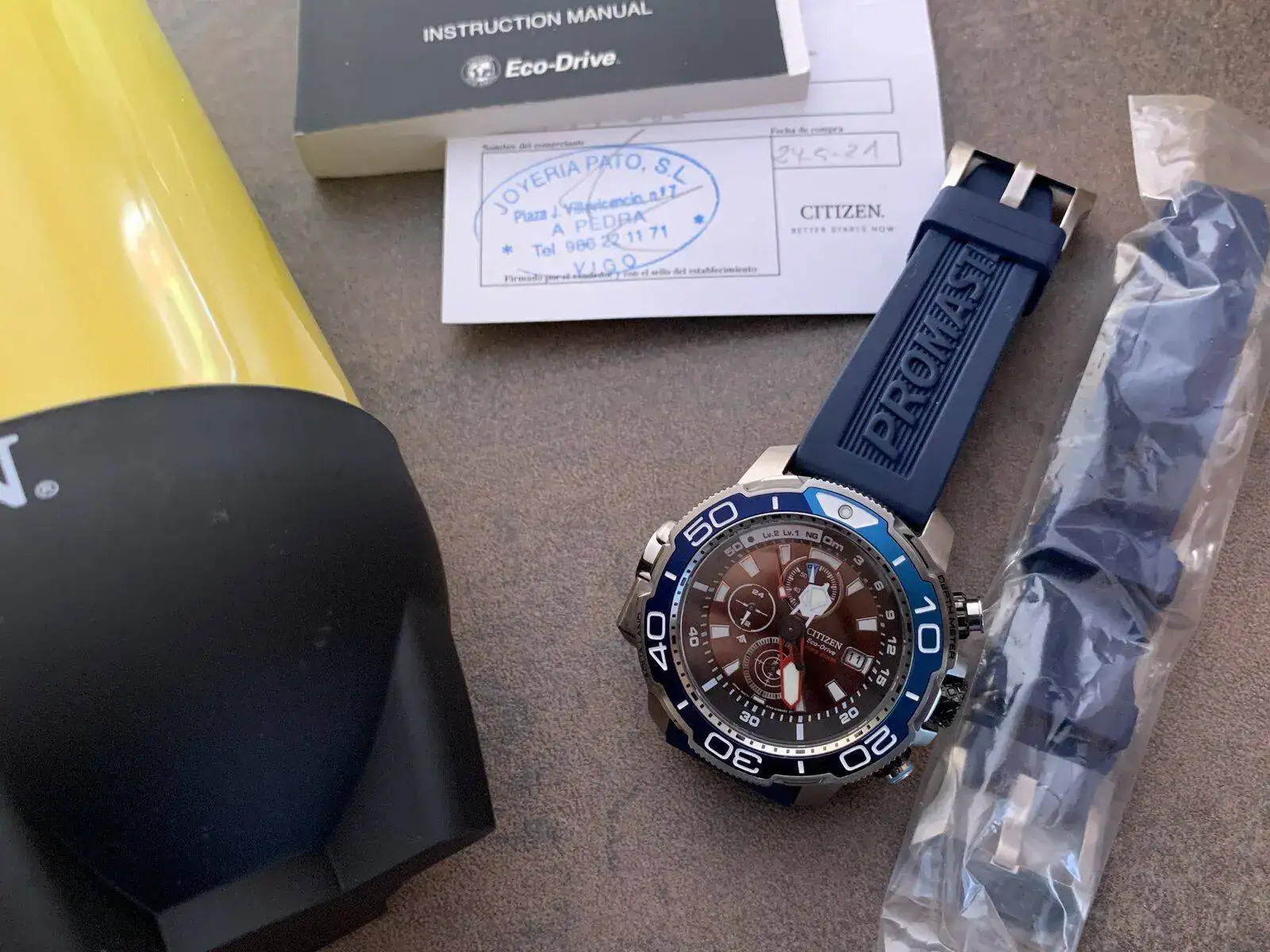 Vendo el último modelo de los Citizen Aqualand Promaster. 200m. Full Set. Movimiento eco-drive con indicador de carga, profundímetro automático y zafiro, en un estado impecable y en garantía hasta mayo de 2023. Con extensión de buceo, la bombona típica de Citizen, 50,4mm, corona y todos los pulsadores roscados. Certificado ISO 6425 y bisel en DLC Duratec.