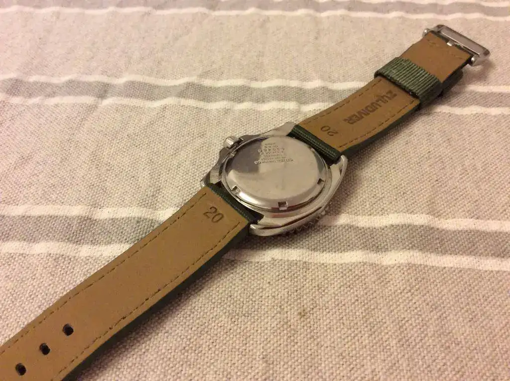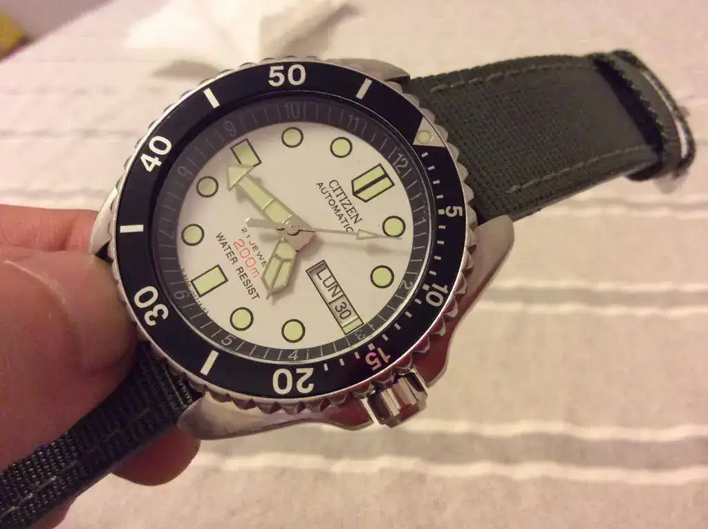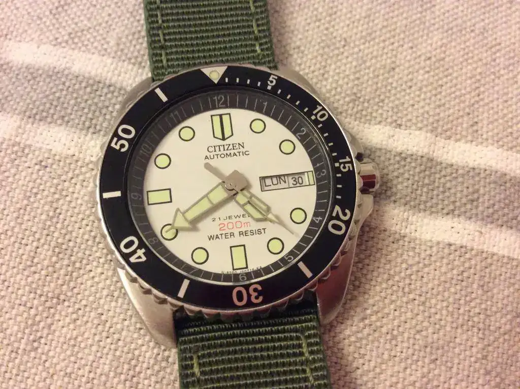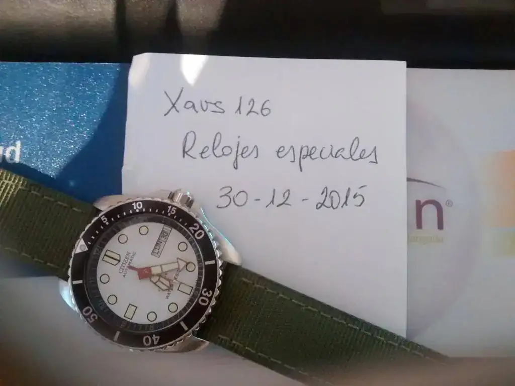 Aquí está mi primer reloj a la venta. Se trata de un diver vintage automático de la marca Citizen. Lo compré en una CRI. Me apetecía un diver vintage y después de rastrear el mercado de segunda mano se vino conmigo, pero no me ha convencido. La caja está en un muy buen estado; salvo unas marcas muy leves en un asa, por la parte interior, con lo que no se ven; imagino que fruto de algún cambio de correa (no mio) con lo que deduzco (en mi ignorancia) que puede haber sido pulida. Algún pelillo, como mucho encontrareis. Yo no lo he visto.