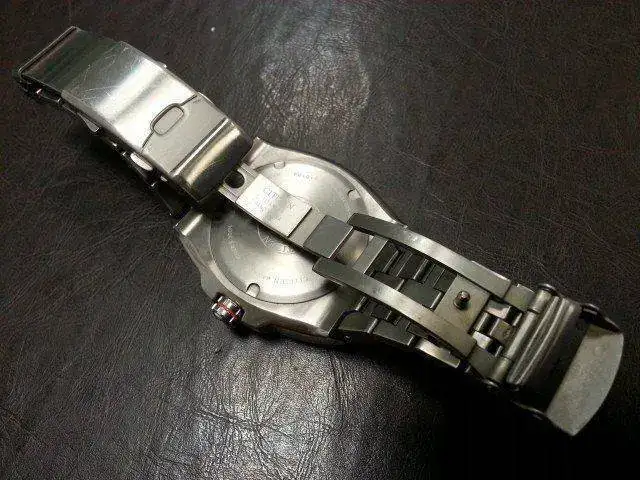 La pulsera es de titanio con doble cierre y extensión para traje de buceo mediante pulsadores laterales, muy fácil y cómoda, apenas notaréis el peso de este gran reloj.