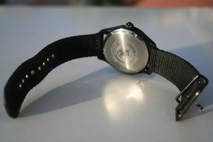 Caja de acero con tratamiento IP negro, fondo cerrado a rosca para asegurar sumergibilidad. Correa de tejido técnico. WR 10 bar.