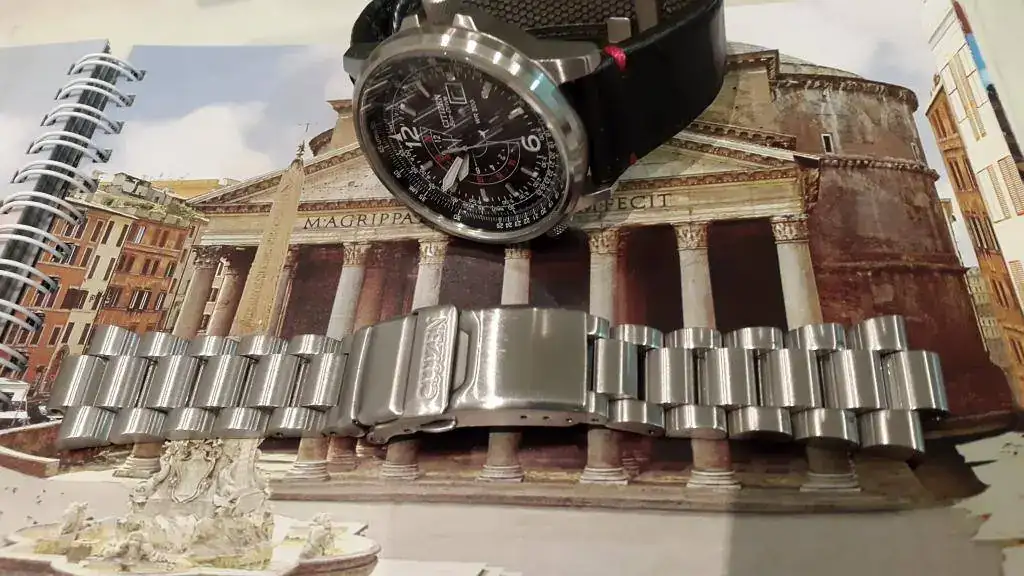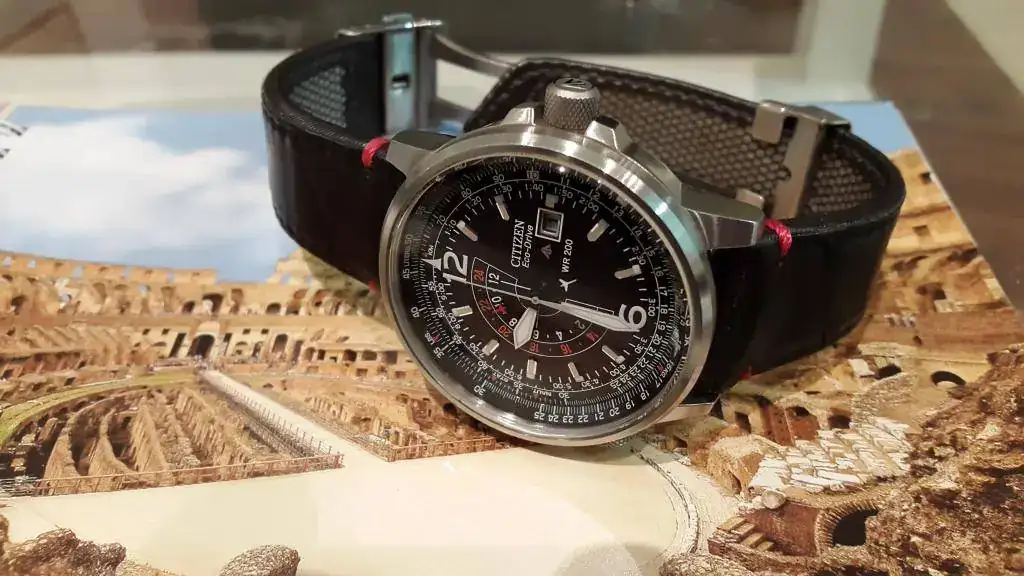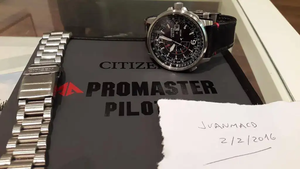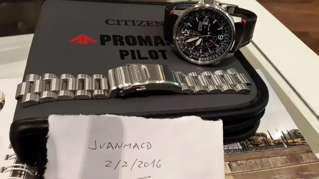 Buenos días, por otro reloj que está al llegar, vendo este Citizen Ecodrive Pilot Nighthawk BJ7010-59E. El reloj fue comprado a un mercante en junio de 2012. Está en muy buenas condiciones, con los típicos pelillos de uso en la caja y el cristal impoluto. Simplemente reseñar una pequeña marca, casi imperceptible que tiene a las dos entre la caja y el cristal. He intentando sacarla en las fotos pero es tan minúscula que apenas se ve. Lo entrego también con el estuche y las dos correas que traía cuando lo compré. La metálica con algunos pelillos de uso y la de kevlar casi perfecta, con muy pocas puestas.