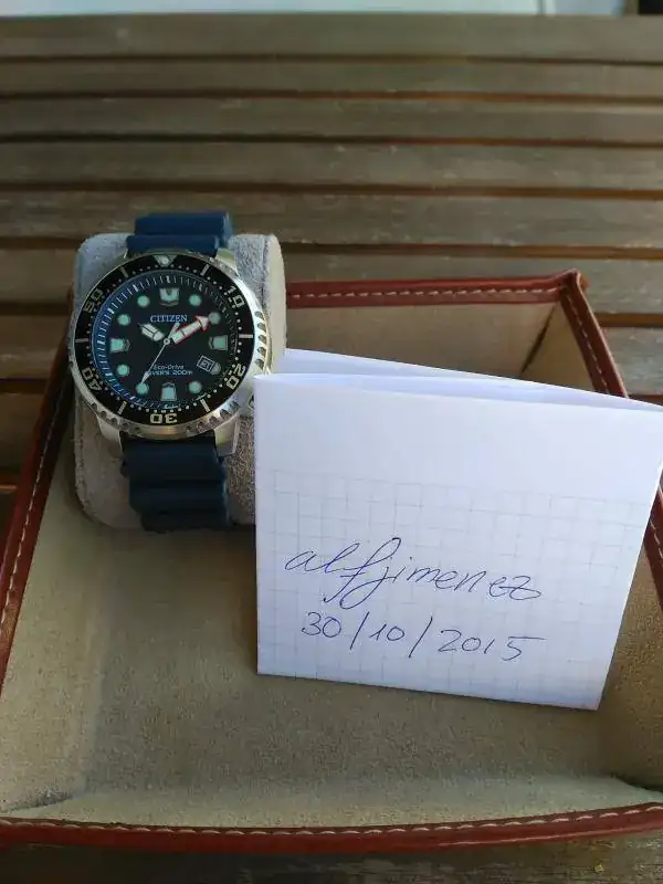 Se trata de un diver ECO-Drive (carga solar) WR200 metros. Su estado es de reestreno a excepción del caucho que, por decir algo, tiene las marcas de la hebilla al abrocharse. Viene con toda la dotación completa y nueva: caja exterior, botella-expositor, garantía, factura de compra, instrucciones, etc... La nato azul marino que aparece ahí tiene la parte que pasa por debajo del reloj cortada. La valoro en cero euros, pero te la regalo para que veas como queda con una nato de ese color: de lujo.