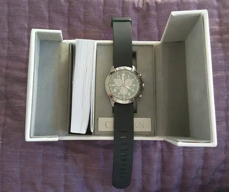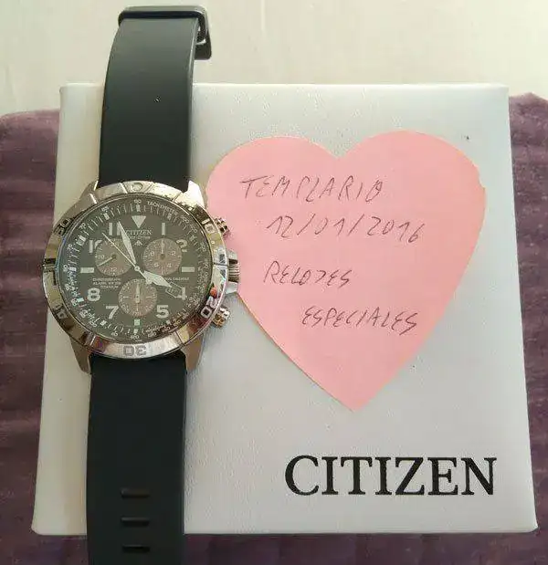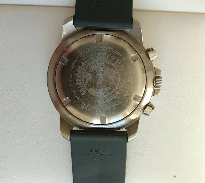 Hola! Vendo este cuarzo eco drive, con muchas marcas en bisel, ya que ha sido puesto una larga temporada. Funciona perfectamente y el cristal de zafiro está perfecto. Caja de 42-42.5mm de titanio, 22mm de asa, buena lume, crono, wr200m, alarma y calendario perpetuo. Entrego con caja e instrucciones y con correa silicona de un lg g watch...