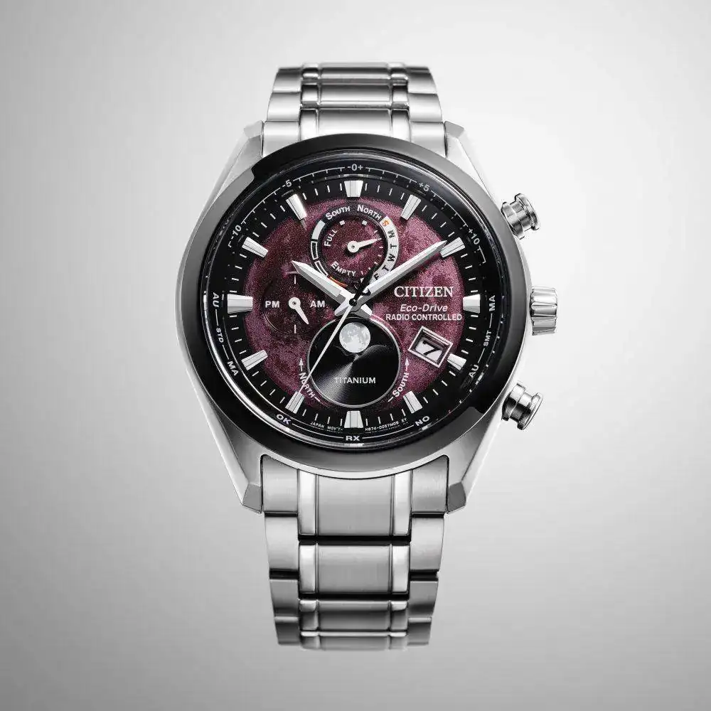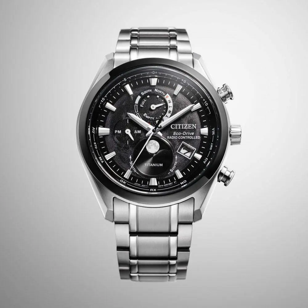 - Movimiento: Eco Drive Radiocontrolado Moonphase H874 con reserva de carga 6 meses (2,5 años en modo ahorro de energía).