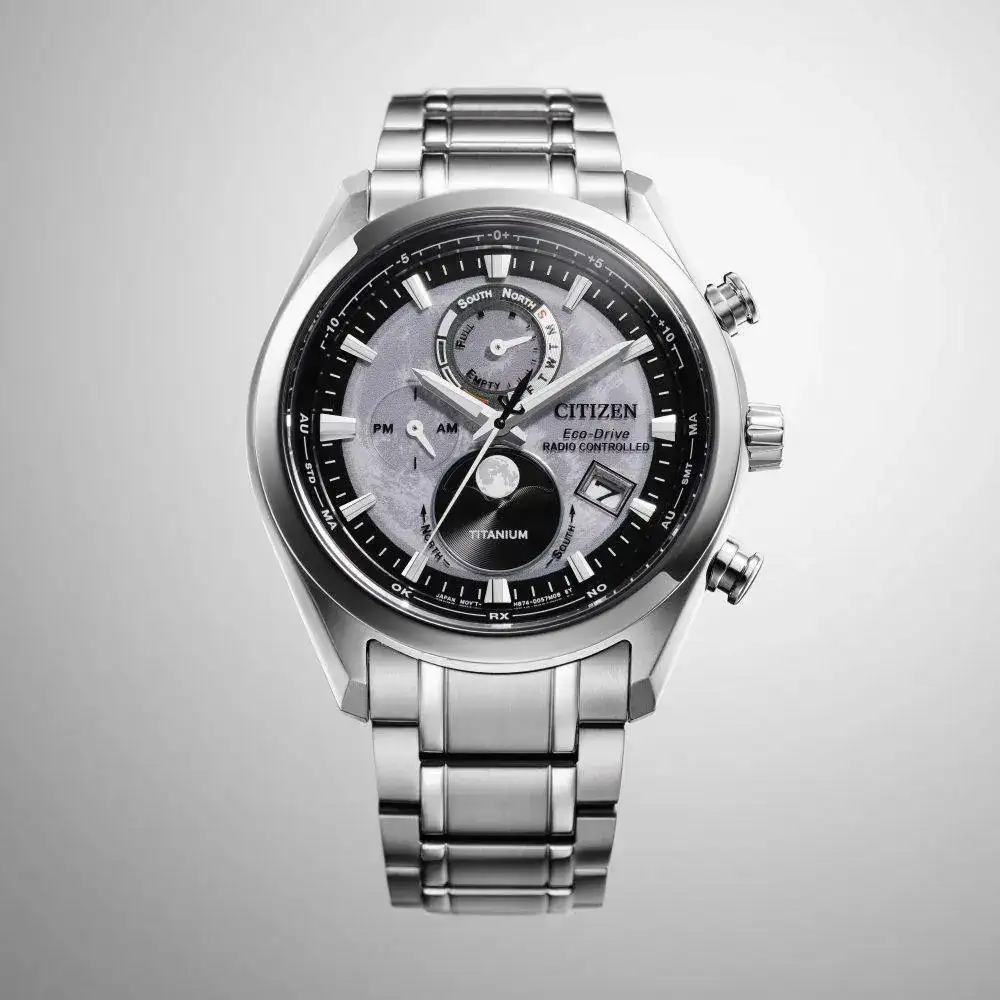 - Funciones: Señalización horas, minutos, segundos, reloj 24 horas. Calendario: fecha y día de la semana. Indicación fase lunar automático, con cambio aspecto hemisferio norte/sur de forma manual. Indicador reserva de carga (4 posiciones). Recepción señal horaria procedente de relojes atómicos: manual, automática y en modo «recuperación automática». Compatible con relojes atómicos de Japón, China, USA y Alemania. Worldtimer 26 zonas (visible en la tapa del reloj). Hora de verano: programación automática o manual. Calendario perpetuo hasta 28.2.2100. Función calibración fase lunar de forma manual. Capacidad antimagnética. Función detección impactos + función corrección automática de agujas.