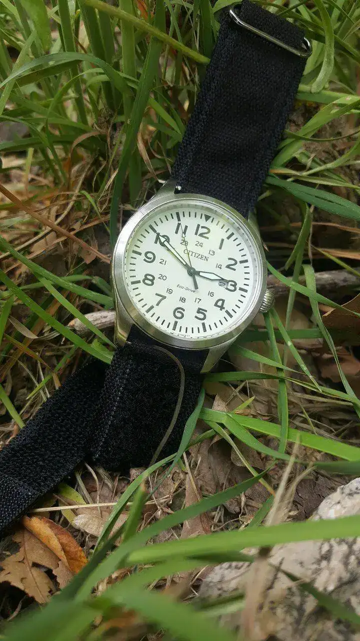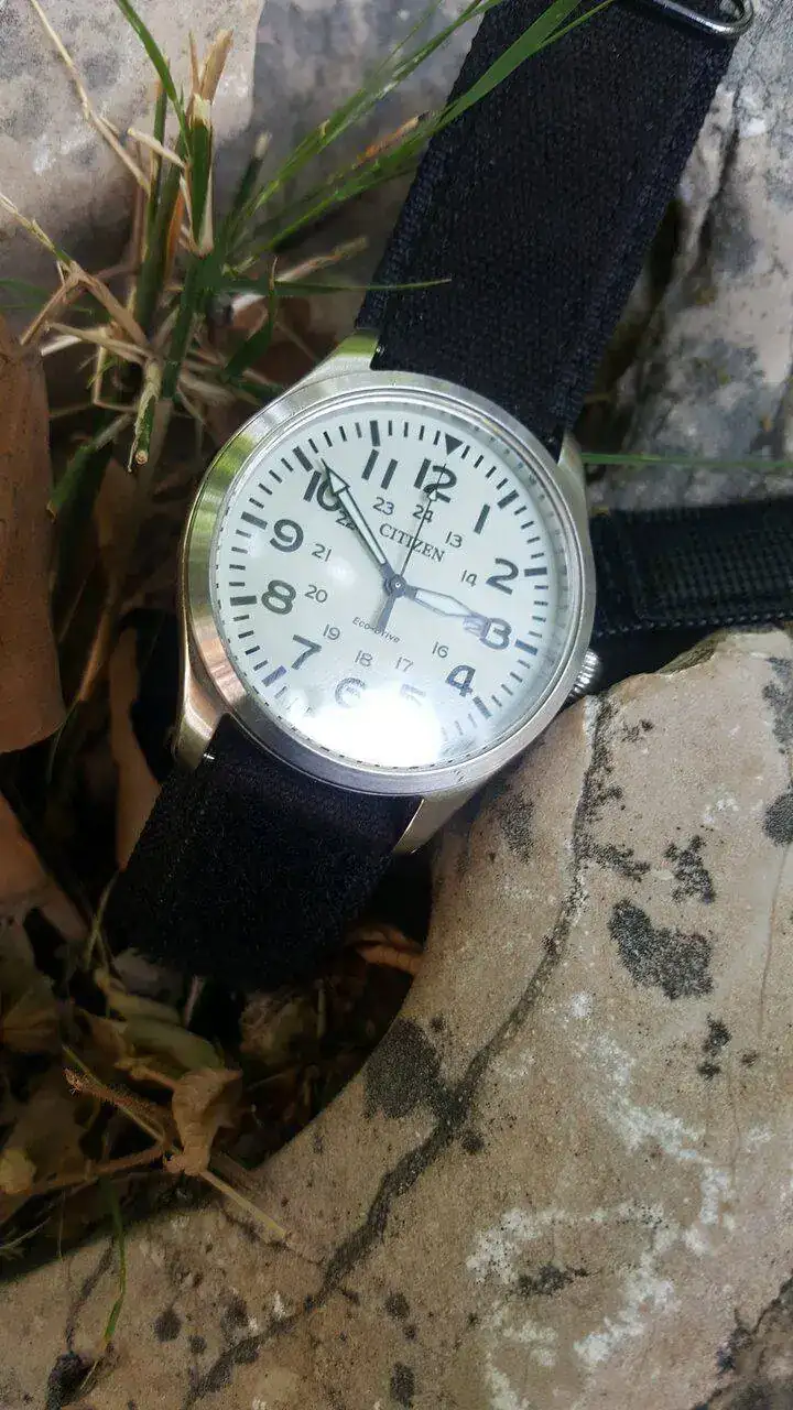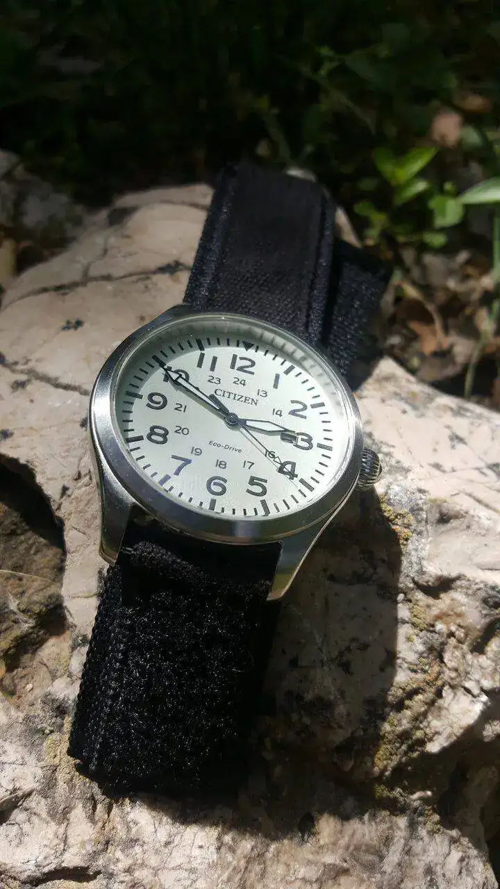 hoy saco este reloj Citizen ecodrive de estilo militar el reloj esta bien, el cristal esta perfecto no le veo defectos mayores , le falta la caja y añado una correa de velcro que se ajusta muy bien a cualquiel muñeca , ademas de su correa original
