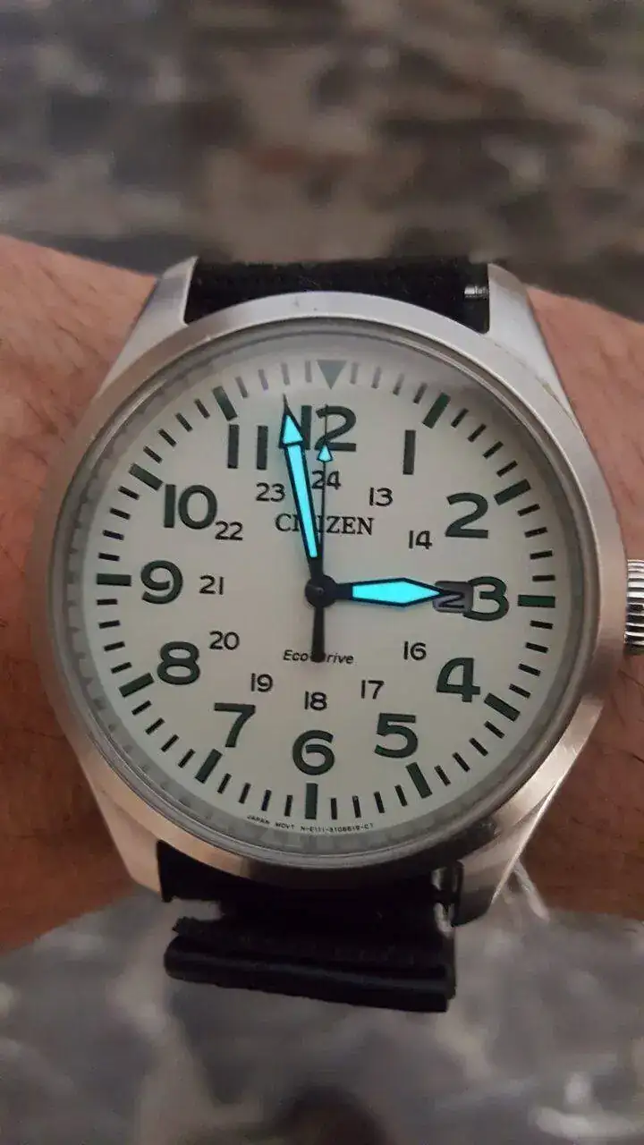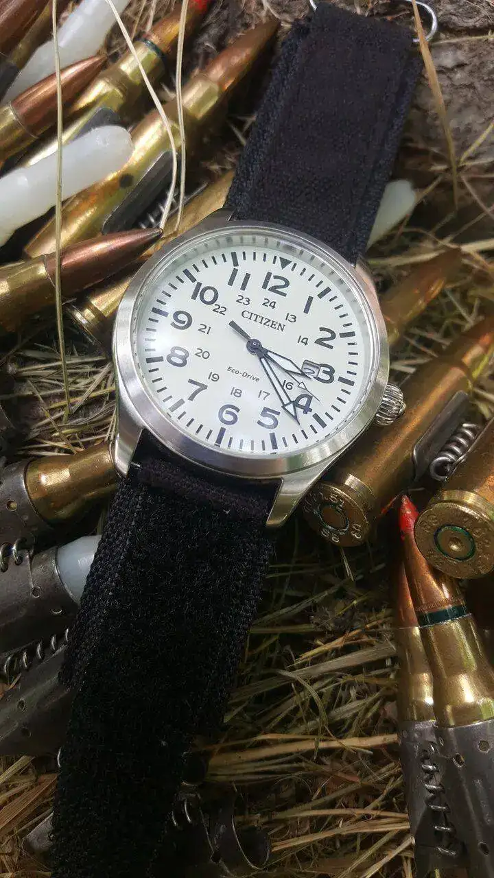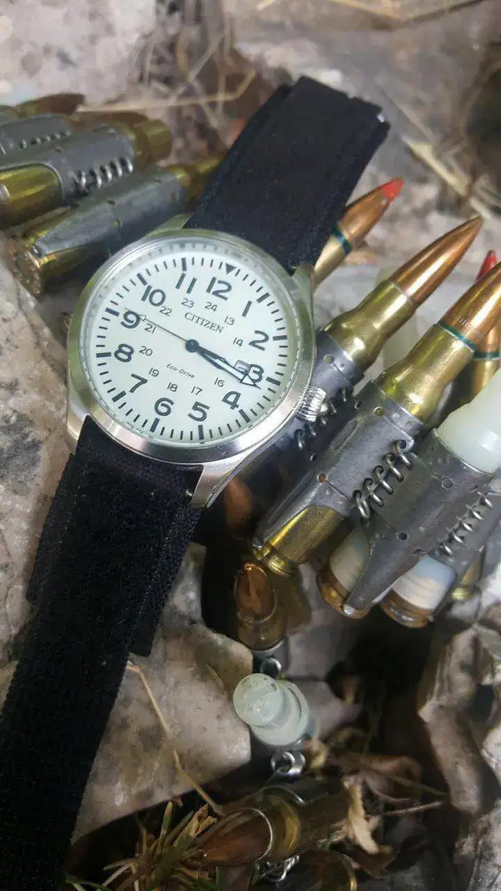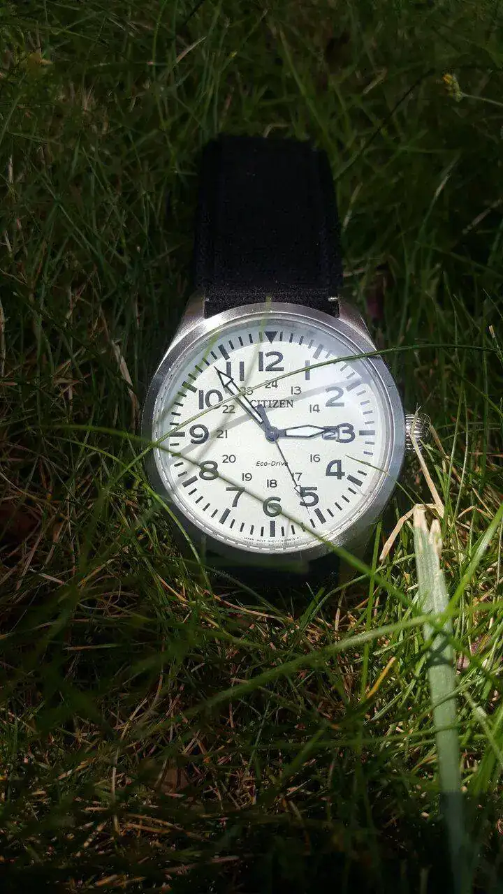 hoy saco este reloj Citizen ecodrive de estilo militar el reloj esta bien, el cristal esta perfecto no le veo defectos mayores , le falta la caja y añado una correa de velcro que se ajusta muy bien a cualquiel muñeca , ademas de su correa original