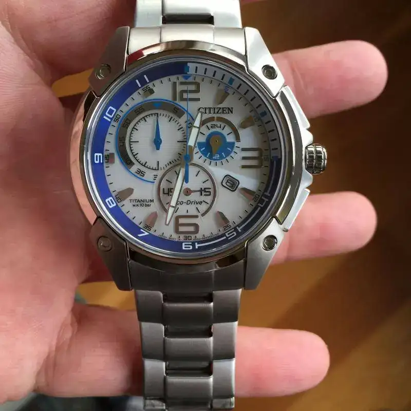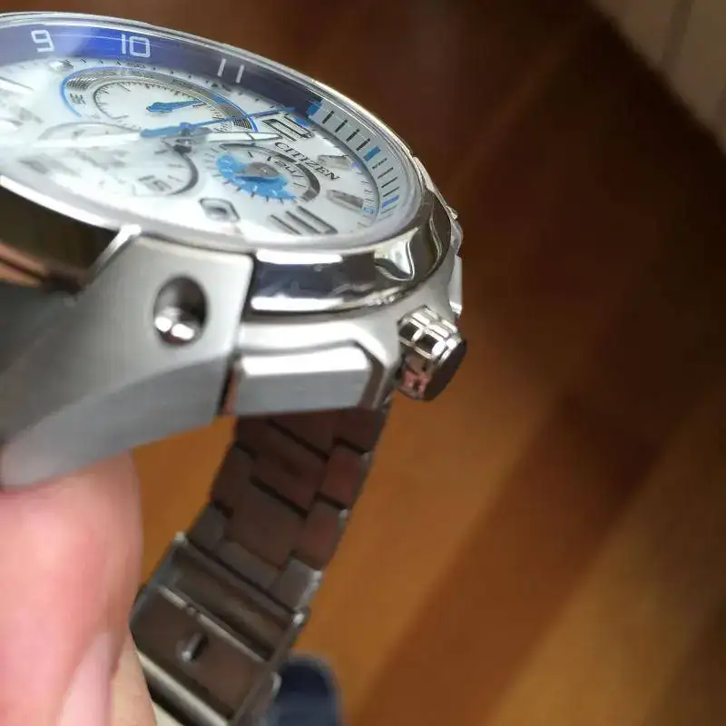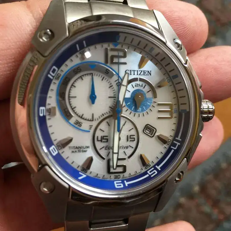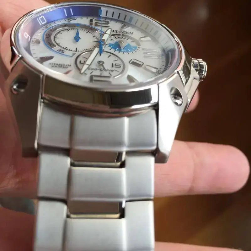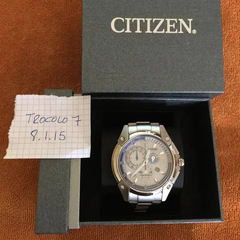 Buenos días. Vendo mi Citizen Marinaut crono titanio con cristal de zafiro, comprado el día 5 de enero del presente año. Lo vendo porque es muy grande para mi muñeca (46mm). Lo bueno es que al ser de titanio, no pesa y es muy llevadero. Quiero resaltar un pelillo en un lado, a las tres, en la parte que está pulida a espejo, que no se nota si no se observa bien y al trasluz. La verdad que no le quita belleza ni prestancia al reloj, pero bueno, los relojistas solemos ser tiquismiquis con estas cosas y debo decirlo. Por lo demás, el reloj está impoluto. Resaltar que el cristal es de zafiro. Me lo he puesto una vez nada más, así que el reloj está flaman. Lo compré en relojería física y tiene la garantía de la casa, dos años completos.