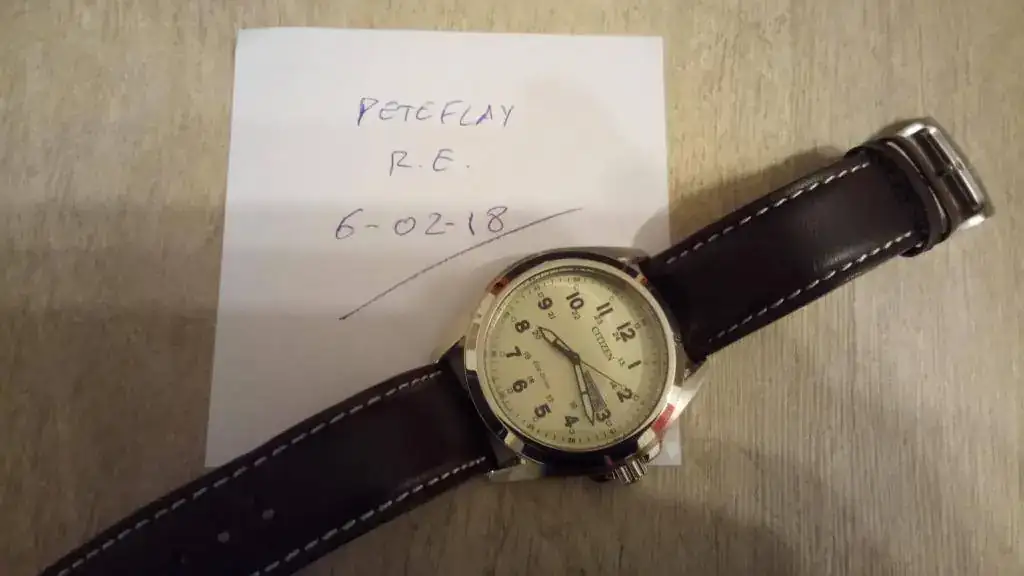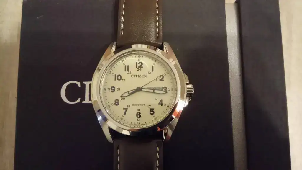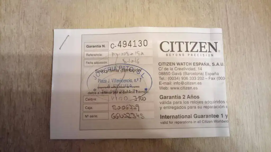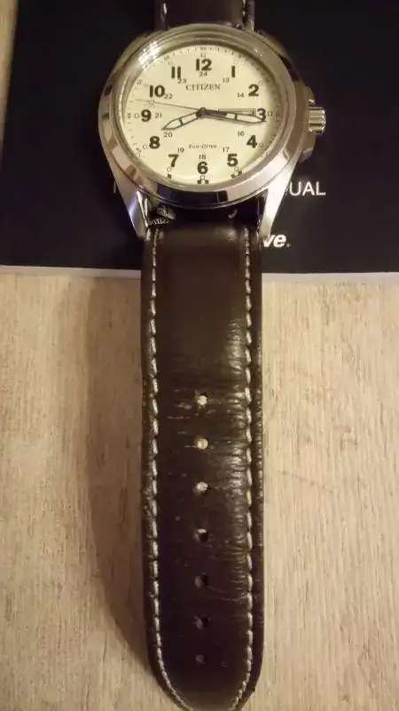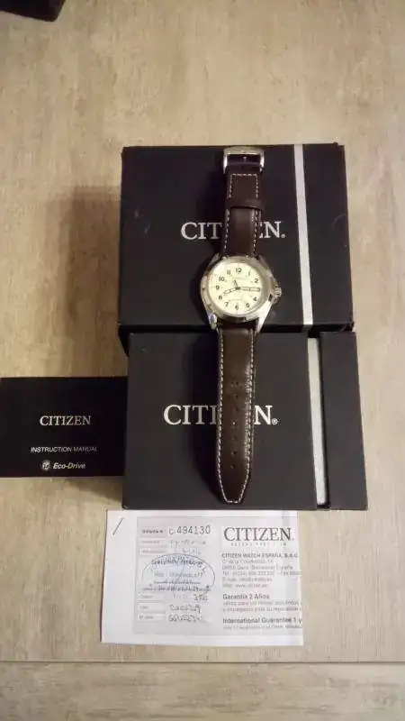 Pues seguimos reduciendo piezas. En este caso un Citizen Ecodrive Military con la esfera color crema y la correa marrón. Como podéis ver, el reloj está perfecto, salvo la correa, que tiene algo de desgaste (amén de que tampoco es muy buena). Casi no ha tenido uso, así que está impoluto (quizás se me pueda haber escapado algún pelillo, pero vamos, imperceptible). Como se ve, está comprado en CO nacional y con la garantía en vigor.
