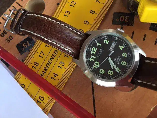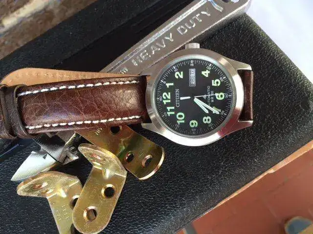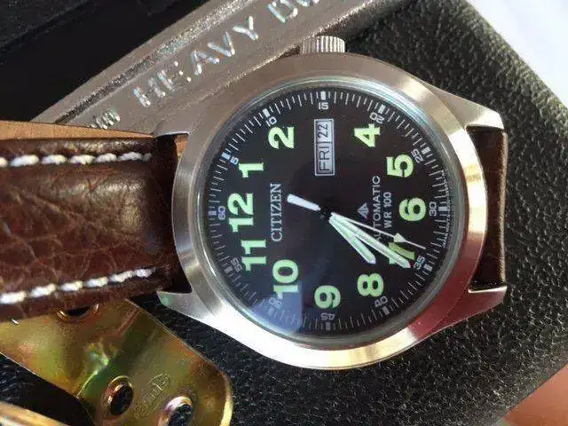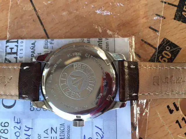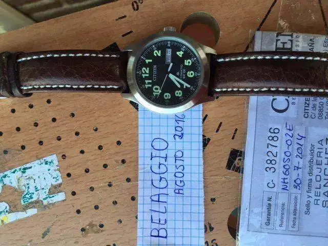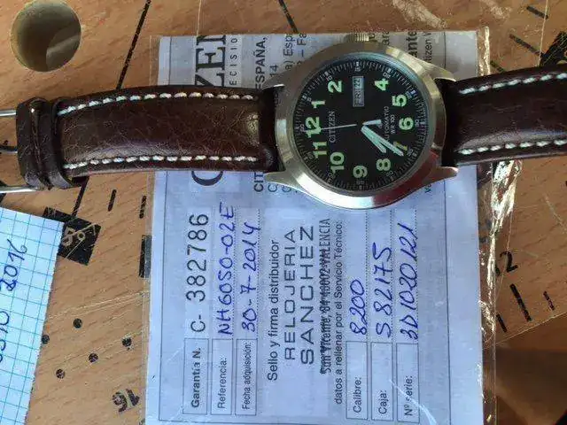 Saco a la venta el conocido Citizen NH-6050, un modelo creo que ya descatalogado por la marca, y algo difícil de encontrar. El reloj está En muy buen estado, pero no es un reloj nuevo. La caja es de acero cepillado, salvo el fondo, que es pulido a espejo, y tiene un diámetro de 40mm sin corona (la cual está firmada con el logo de la colección Promaster), y lleva también el logo de Promaster. Es sumergible a 100m. El lumen es bastante decente. La correa original es de piel marrón, esta muy usada y no es resistente al agua como todo el mudo piensa, estando en mal estado por lo que he deficiso sustituirla por una color tabaco con prespunte blanco con la en la hebilla original. El cristal es mineral y el movimiento es el Citizen 8200, automático y con remote manual. por ultimo decir que el reloj tiene los papeles pero no tiene la caja, no obtante le pondre una caja que haga la misma funcion-