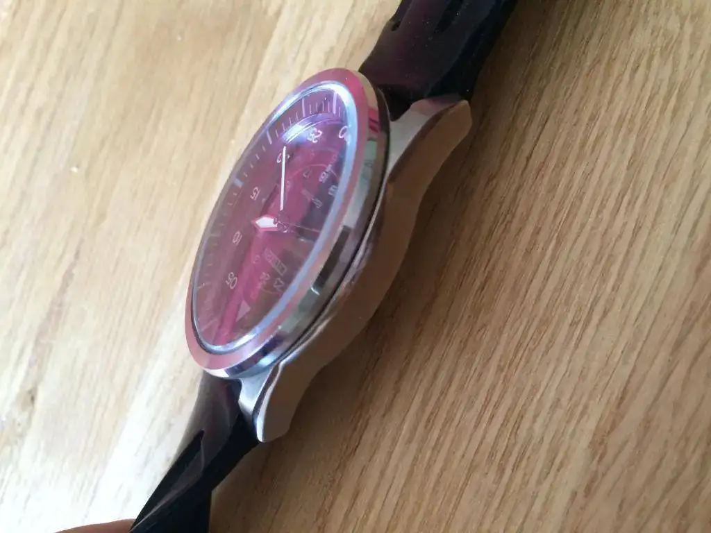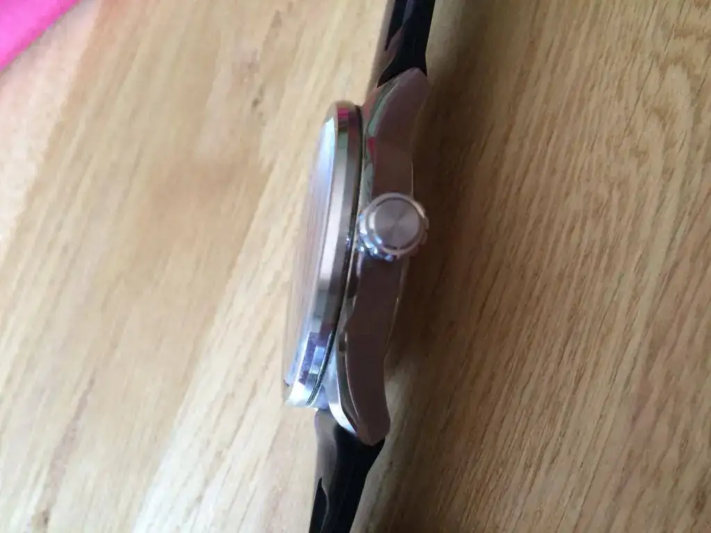 Lleva una correa de goma o silicona genérica , muy cómoda y blanda.