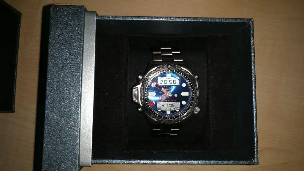 Esfera azul brillante con combinación de pantalla analógica / digital. Marcadores de agujas y horas de color Brillante / Rojo Luminoso con características luminosas en ellos