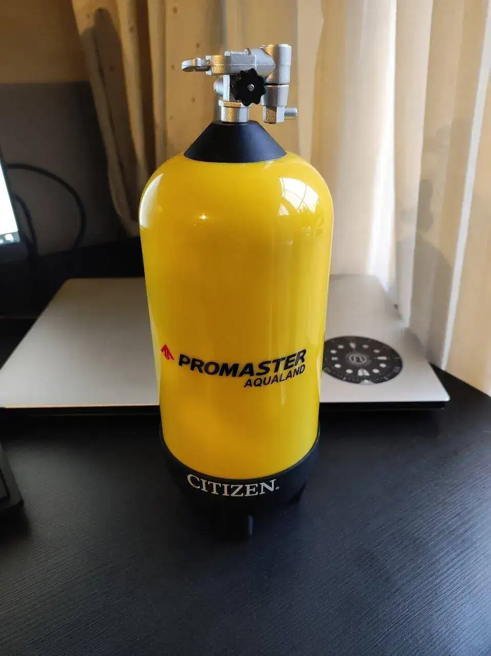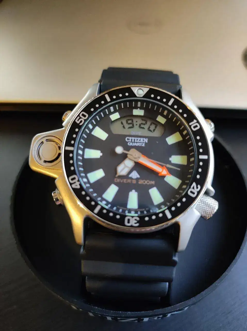 Las razones de mi resistencia eran básicamente dos. La primera que es un cuarzo que ni siquiera es Eco-Drive. Evidentemente esto no hace más que denotar mi falta total de cultura relojera por despreciar un cuarzo solo por ser cuarzo, pero bueno, aprenderemos poco a poco. La segunda es que, por motivos que no vienen al caso, yo llevo el reloj en la derecha y tenía miedo de que me molestara el apéndice del profundímetro digital, pero me probé uno y comprobé que no era así.