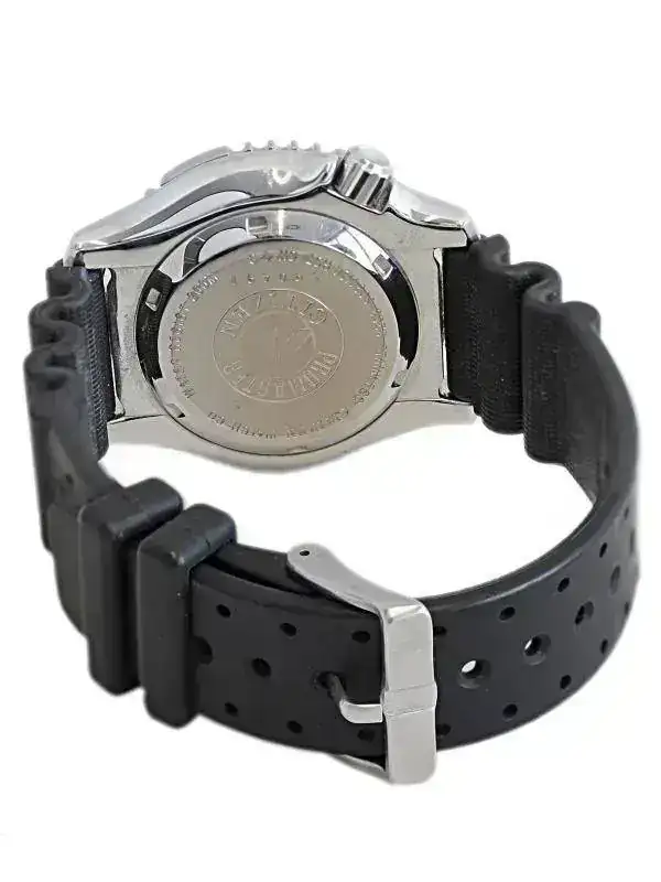 El reloj tiene una caja de acero de 44mm, toda cepillada, con fondo y corona roscados, pesa 93.6 gr y es WR 200m (¿será realmente 500m como el NY0040?). El espacio entre asas, para las correas, es de 20mm, y la distancia entre asas ("lug tu lug") es de 49mm. El bisel unidireccional es de sesenta clics, algo que a alguna gente le disgusta, pero que en mi opinión no afecta a su funcionalidad. Como observación para maniáticos, el inserto está perfectamente centrado, pero no así el bisel, cuyas ranuras no quedan equidistantes con el centro del triángulo (quizás se vea en alguna foto). Vivid con eso, obsesivos compulsivos. Todo lo demás está perfecto, con un inserto, anillo interior e índices perfectamente alineados y una segundera que salta exactamente ante cada marca de los segundos.